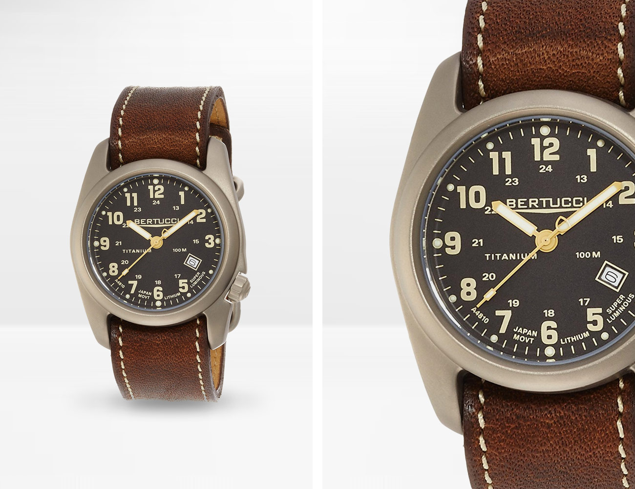 A quality watch at under $1200 isn’t that rare of a find, but one featuring a case made from titanium is. Additionally, this Bertucci has a Japanese-made quartz movement running a lithium battery, which the brand says is good for a 10-year life. A thick leather strap is a nice touch, and the dial has plenty of lume for legibility, which makes it particularly perfect for outdoor excursions.