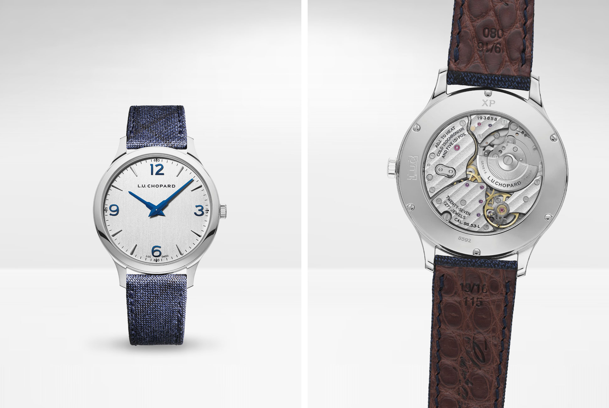 Chopard’s watches generally tend to skew more classical, but the XP is a decidedly modern take on the ultra-thin dress watch. The clean dial is finished with vertical brushing, giving it the look of raw metal, while the numerals and hands have been treated in an eye-popping blue. (A cashmere strap is also a unique addition). The scant 7.2mm case houses an in-house automatic movement from the brand that comes in at just 3.3mm thanks to a micro-rotor design.