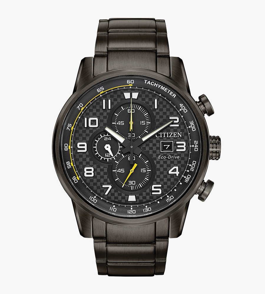 The stainless steel case and band on Citizen’s Primo Chronograph are built for speed. Swim, snorkel or shower with this water-resistant watch, and the mineral crystal face accented with black luminous hands and markers will remain clear as day. The jet black dials and buttons, meanwhile, keep up the sharp look.