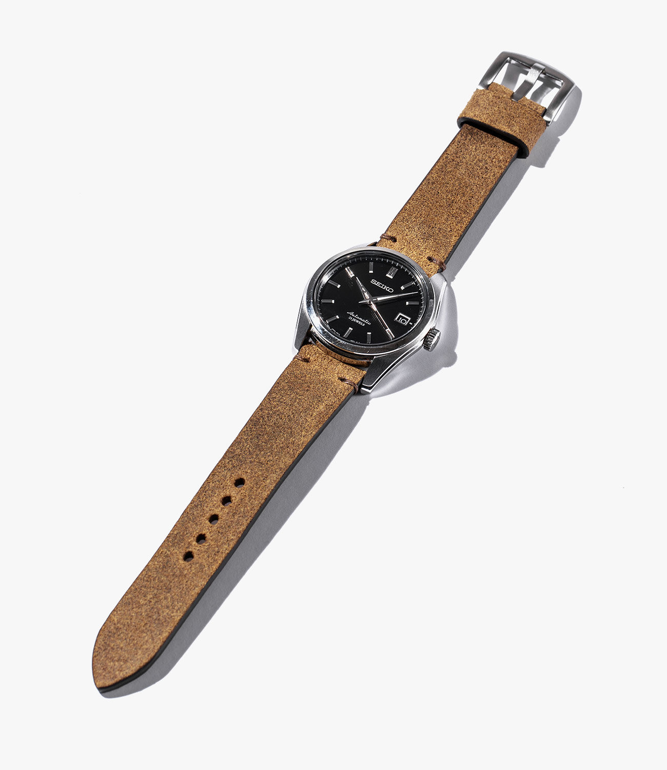 We reviewed the Rich Brown color in 18mm, though each of the available colors has the same features: a smooth calf leather that’s skived, folded over and glued to form a smooth back, white cotton stitching beneath a brushed steel buckle, cream-colored stitching beneath a fixed leather keeper and at the corners, sliding leather keeper, and painted sides in a matching color. The five available colors (which include three shades of brown and two of grey) will pair with almost any dial color out there, and really the only fault I can find with these straps is that there isn’t one available in black (I would personally use as an alternative one of the grey versions on a black-dial watch, such as a Sub, which is a killer combination, by the way).