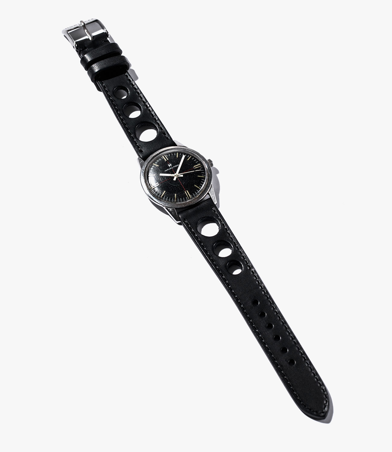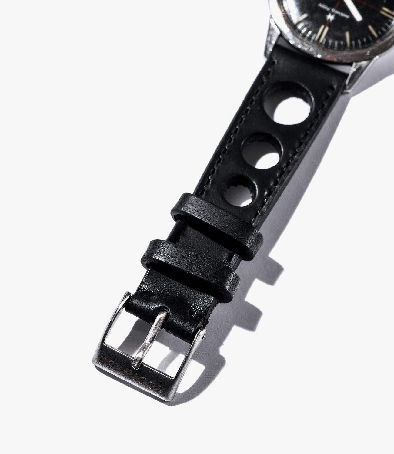 The Rallye strap, available in black and handcrafted in Italy, differs from Hodinkee’s “Racing” straps (available in black and two shades of brown) in the size/design of the holes that perforate the leather (the Rallye features three larger holes in ascending sizes rather than a pattern of smaller holes). The style cues here are pure 1960s vintage racing, so of course the Rallye looks perfectly at home on vintage racing chronographs, such as Daytonas, Carreras and Autavias, but will pair well with many types of watch.