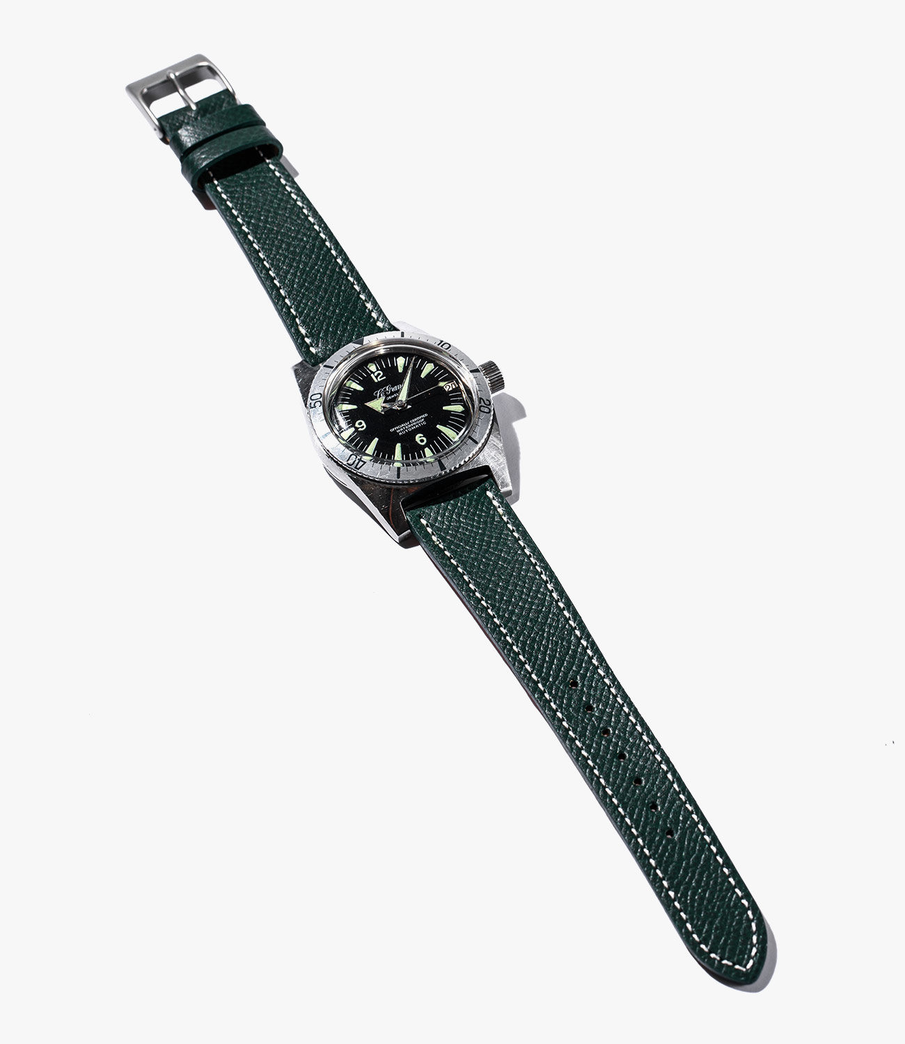 An incredibly smooth textured calfskin strap with contrasting white top-stitching available in 5 sizes (including 21mm), this offering from Hodinkee will look great on, well…pretty much anything. Variations of this strap are available in different colors and finishes (with different pricing depending on the leather used), so there’s something here for everyone, but the hunter green version is particularly striking – we paired it here with a vintage skin diver from Le Gran and it really brings out the tritium on the dial.