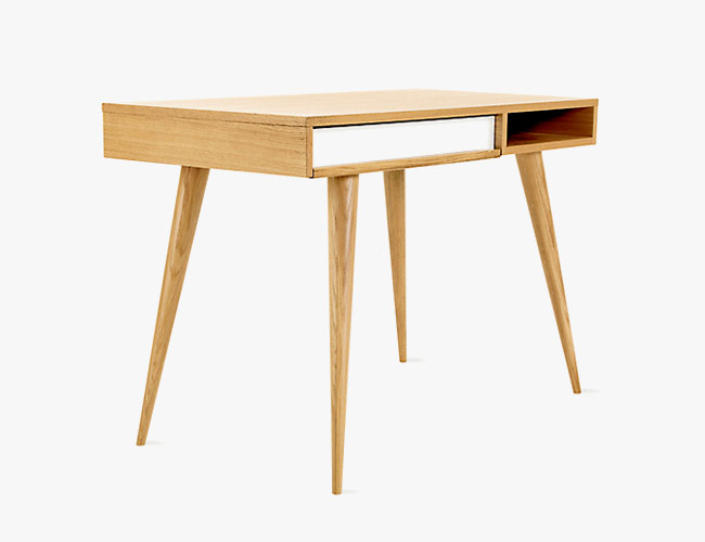 This spread-leg desk is the product of Good Design and Design Plus Award-winning furniture designer from Iran, Nazanin Kamali. Beyond an open cubby and large drawer, it’s characterized by its blend of mid-century shape, connical legs and compact size.