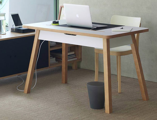 Tech meets tradition. Artifox’s Desk 02 (which also comes in walnut and a lighter oak) is made black with ink and given a sattin finish. The desk features a cable management system, a headphone hook and a clever felt cable grip keeps cords in place. The desk arrives in separate parts and can be assembled in short order.