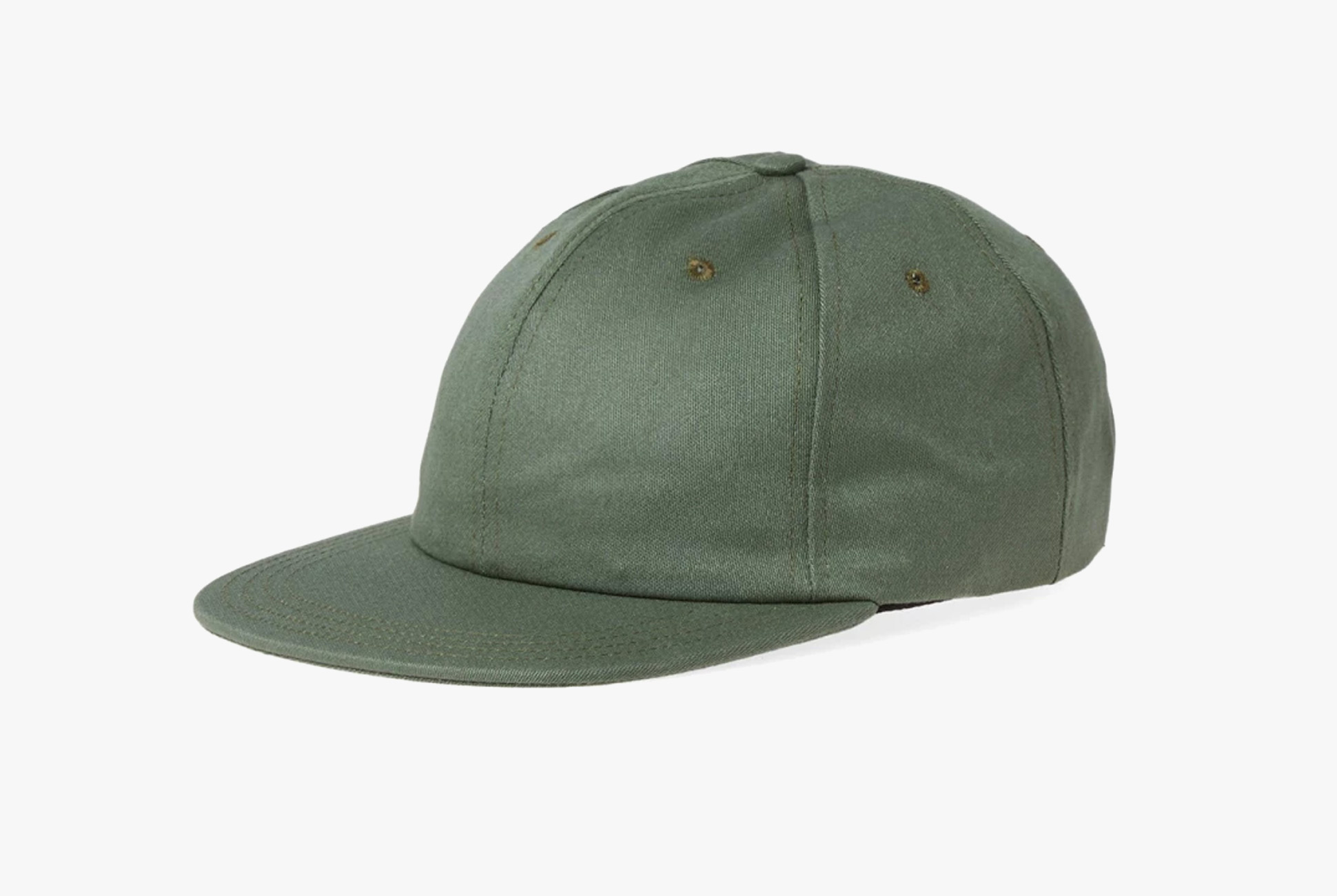 Cut from olive sateen cotton fabric, this cap features an adjustable cloth strap, a flat peak and embroidered eyelets. It’s also made in the USA.