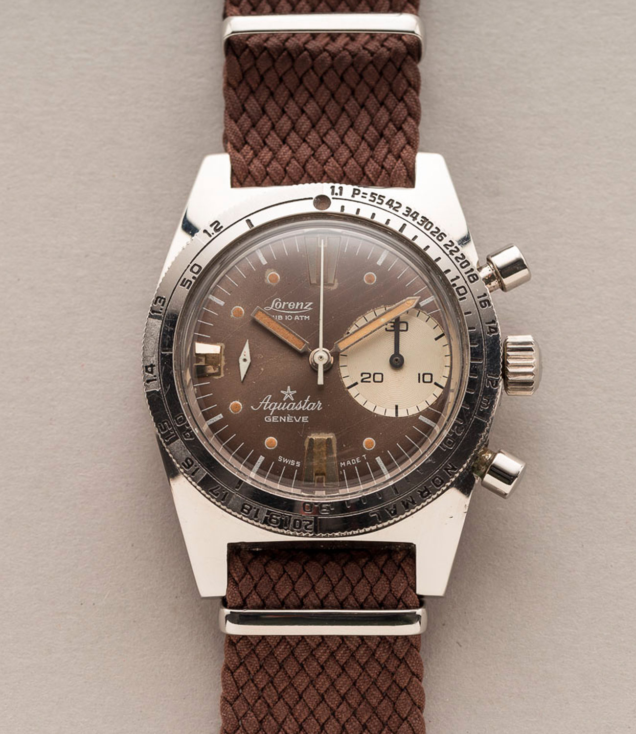 The case is the standard “skin diver” variety, water-resistant to 100m, but the combination of the chronograph pushers, the unusual dial arrangement and a rather complicated diving bezel gives the watch a unique, beautiful look. It certainly helps that professional divers such as Jaques Cousteau appreciated the practical benefits of the chronograph, the first of its kind in a dive watch. Cousteau and his crew, who were associated with numerous dive watches during Cousteau’s long career, began an association with Aquastar in 1965 that continues for nearly a decade.