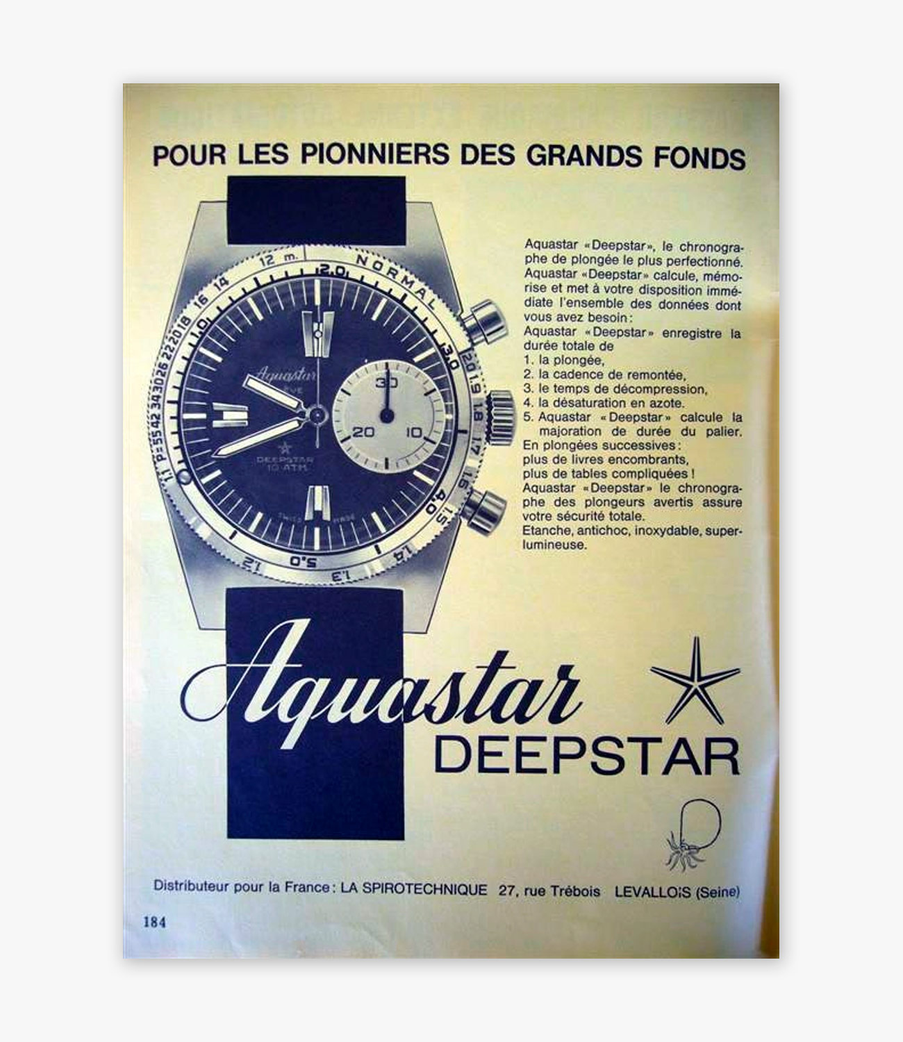 Perhaps the funkiest of these vintage divers is actually a chronograph produced in the 1960s called the Deepstar, produced by a company called Aquastar (we know, we know — lots of “stars”). Aquastar was founded in 1962 by Frédéric Robert, a longtime SCUBA diver. JeanRichard, Squastar’s parent company, filed a patent in 1958 for a design that would become the brand’s first dive watch, called the Aquastar 60. Retailed under several names, depending on the market, the Aquastar line became so successful that its popularity eclipsed that of the other sub-brands.