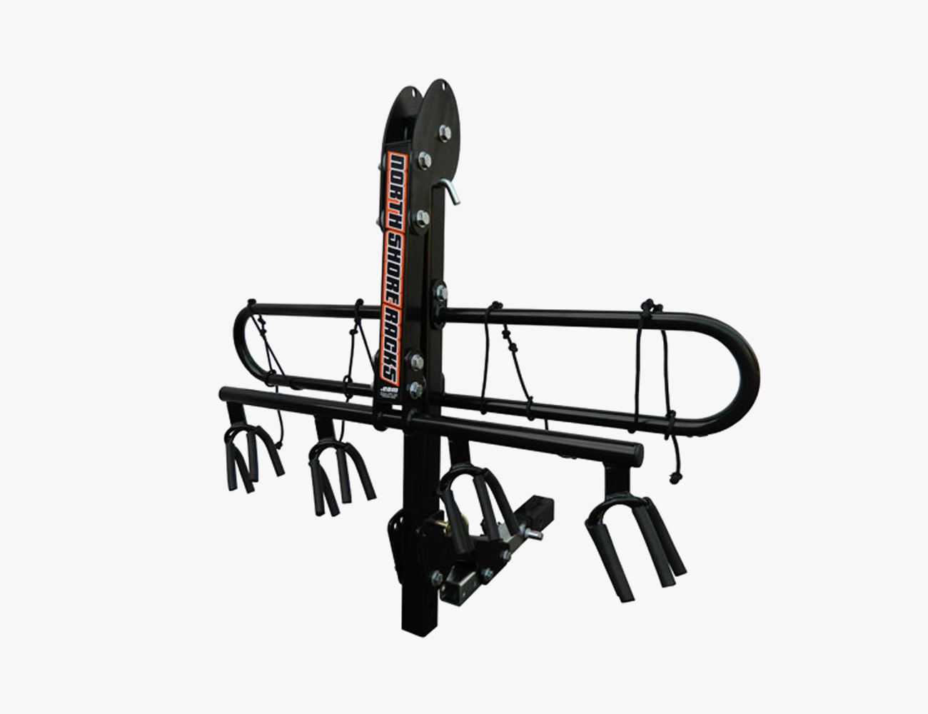 North Shore Racks’ NSR offers a vertical alternative to the hitch-mounted rack, positioning up to four bikes upright and next to each other behind nearly any vehicle. The front wheel hangs tilted from a rubberized fork while the rear wheel locks to the frame with an easy-to-use rope and knot system. This way, the bikes can be positioned as close as possible without touching, and less space is used overall. This rack was designed for mountain bikers by mountain bikers, and as such it’s best for mountain bikes (read: not road bike compatible).