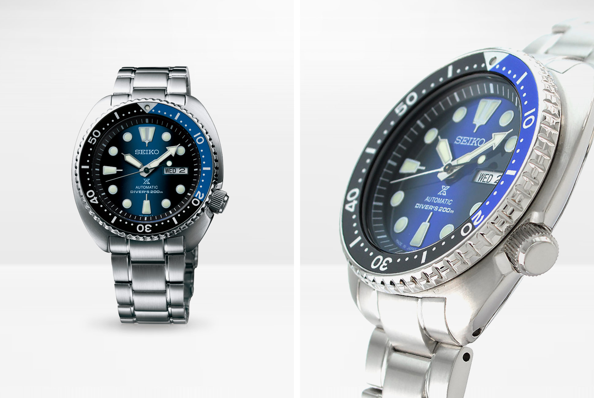 The Japanese-market SBDY013 is the same “Turtle” we know and love in the United States but has a stunning dial and bezel we don’t, unfortunately, get stateside. The dial is a shimmering gradient of black and deep blue, while the bezel is black with a blue count-up section for the 12 o’clock position to three o’clock.
