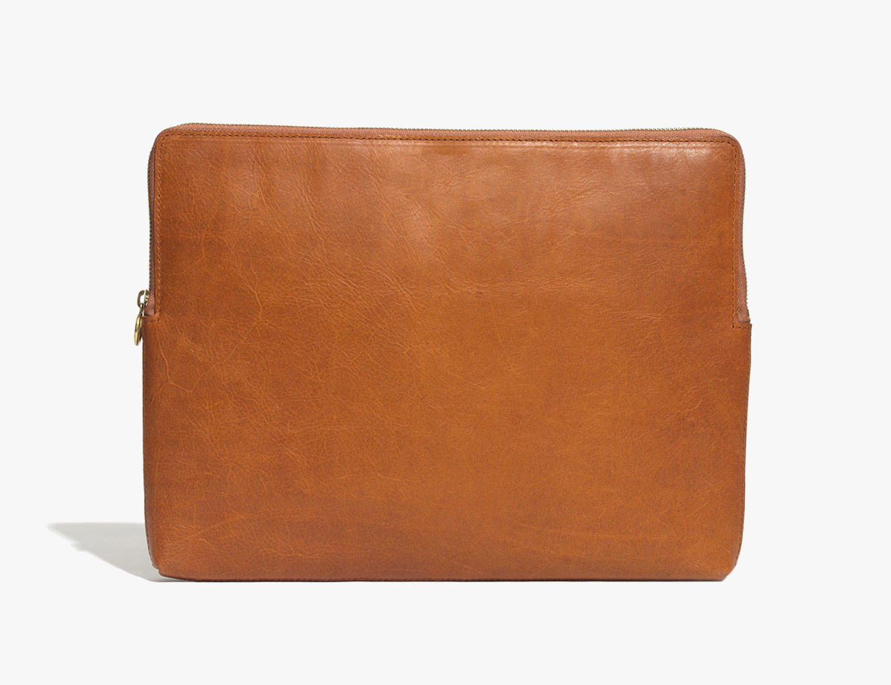 The good: It feels like a traditional elegant leather accessory — very clean and minimalist. The zipper wraps well past the corners of the case, meaning you can open it wide, making it easier to slide your laptop in and out. It looks nicer and is significantly cheaper than the leather case that Apple sells.