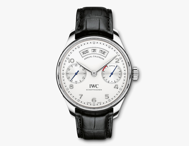 IWC debuted the new Portugieser Annual Calendar at the 2015 SIHH gala with an all-new movement and contemporary good looks. The movement, developed in house in Schaffhausen, has a full seven-day power reserve and shows the month, date and day in the “American” style (month first) in deference to IWC’s American founder, F.A. Jones.