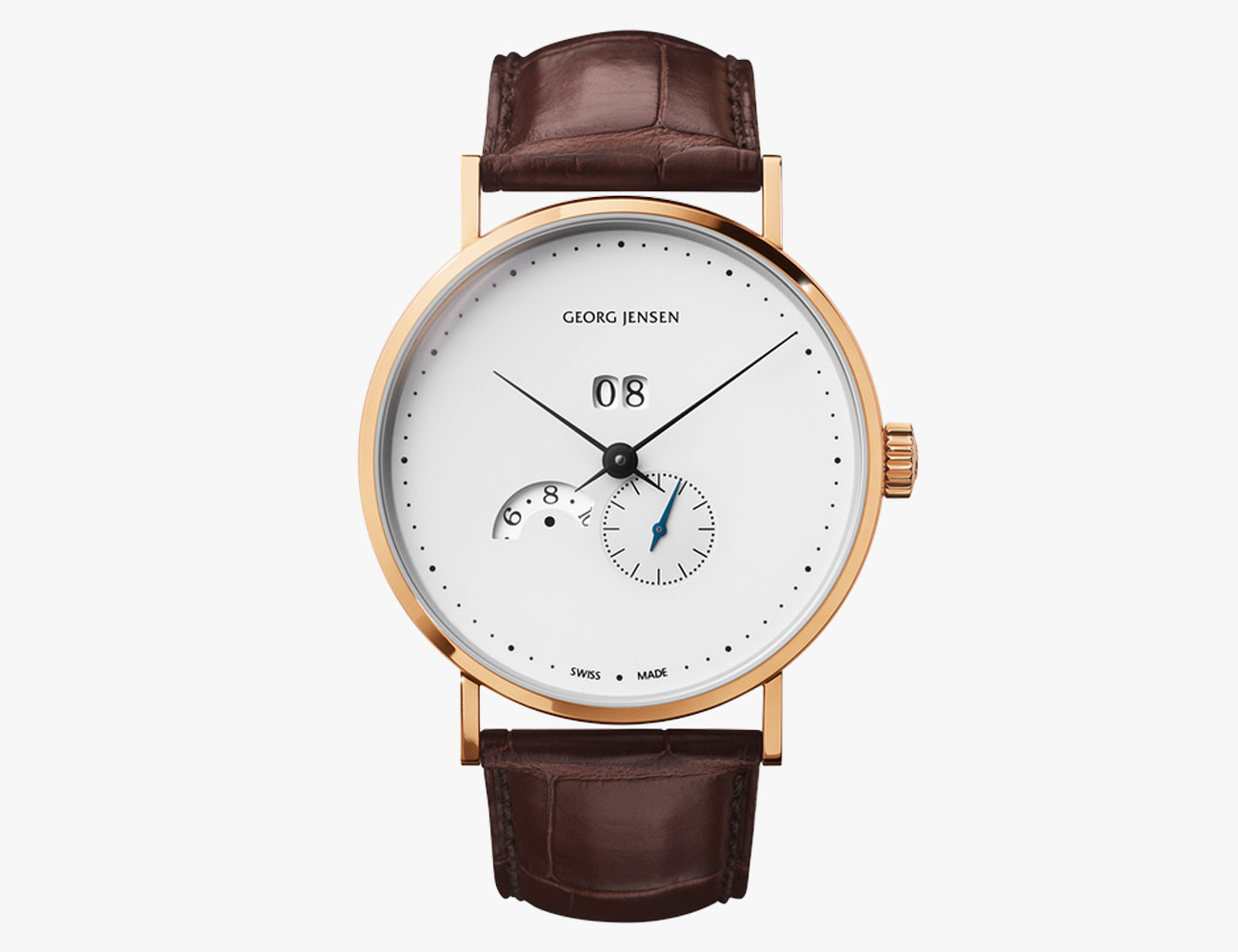 Georg Jensen is better known for silversmithing, but the brand has recently made a concerted effort to produce timepieces befitting its Danish design heritage. The Koppel Annual Calendar veers from the classic norms of this watch category with a clean enamel dial, a small seconds sub-dial and a minimalist approach to displaying the calendar, using an offset arc-shaped aperture for the month and the date front and center.