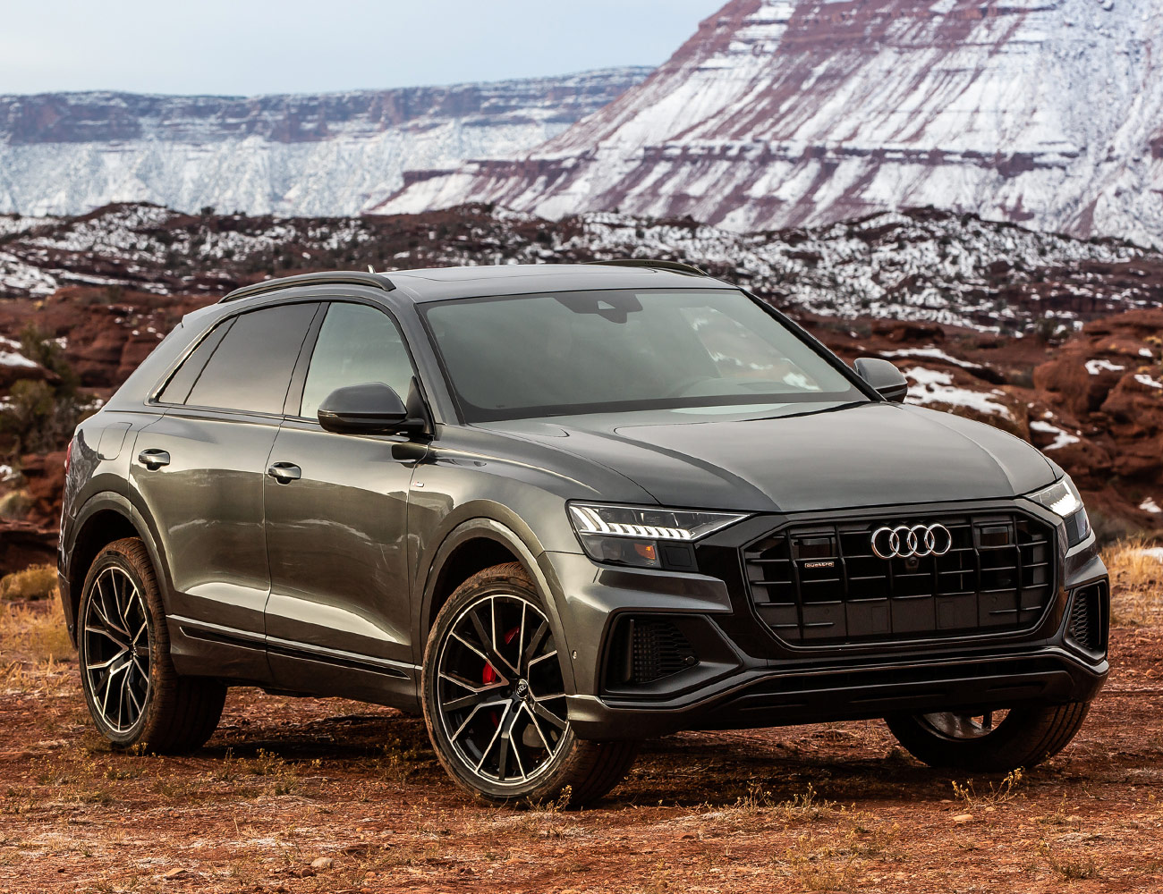 The Q8 is Audi’s SUV equivalent of the flagship A8 sedan. Introduced in the 2018 model year, it shares a platform, powertrain (335 hp 3.0-liter TFSI V6), and relative price point with the base model Porsche Cayenne. Buyers can add features such as four-wheel steering. The Q8 can accelerate from 0-60mph in 5.6 seconds.