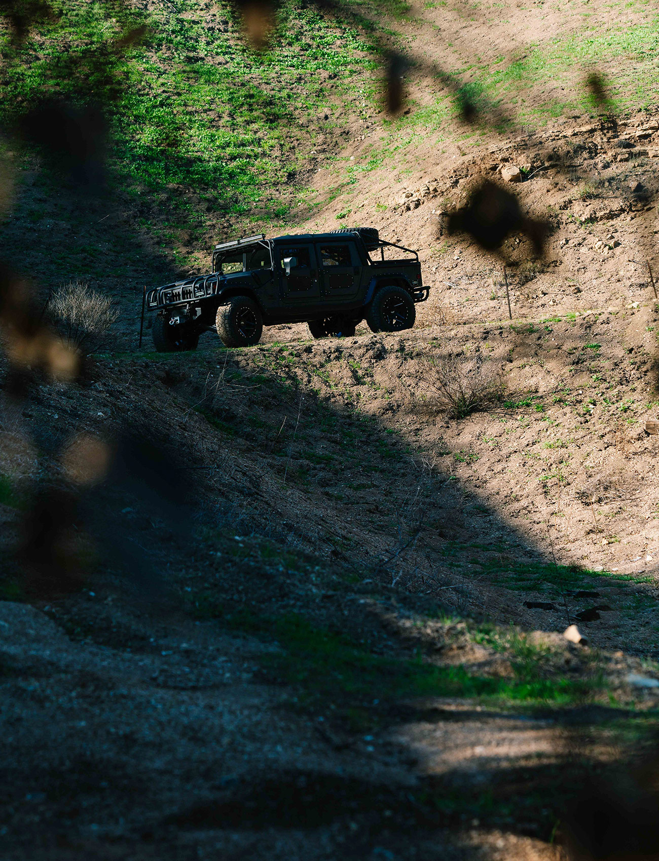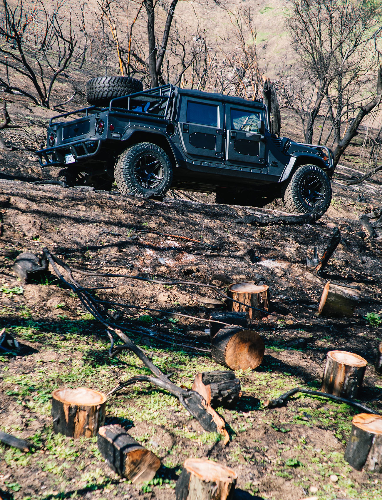 None of that matters to me as the H1 and I sling mud around a mountain top. All that matters is how hilariously fun this truck is. I’ve got the remastered edition of Black Sabbath’s Vol. 4 pumping through the JL Audio system as I rollover more technical sections of this “top secret” test trail without hesitation. Shortly thereafter I’m back on the 101 freeway cruising comfortably at 75mph with one hand on the steering wheel. A minivan comes up alongside me on the right, and the driver gives Chassis #001 a once over and nods. A head appears from his far side: a kid leaning forward to catch a glimpse from the passenger seat. He gives me an enthusiastic thumbs up. If only he knew the half of it.