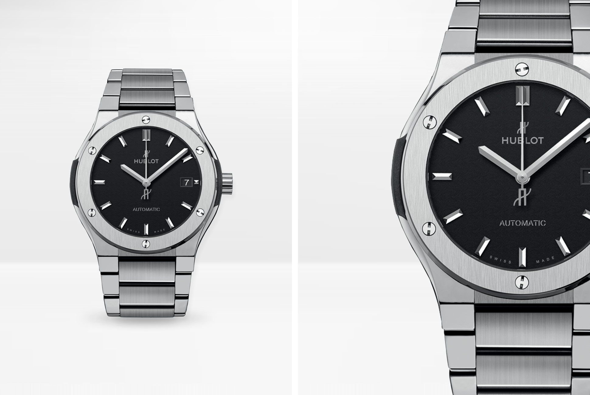 Hublot is known for making some pretty wild designs and using some equally insane materials, but the Hublot Classic Fusion is much more pared-down than its stablemates. The watch’s integrated design is constructed from titanium and features both satin and polished finishing, giving the finished product a two-tone-like effect. Further, working in the watch’s favor is the fact that it’s available in a few sizes, ranging from 33mm to 45mm, providing plenty of choice to prospective buyers.