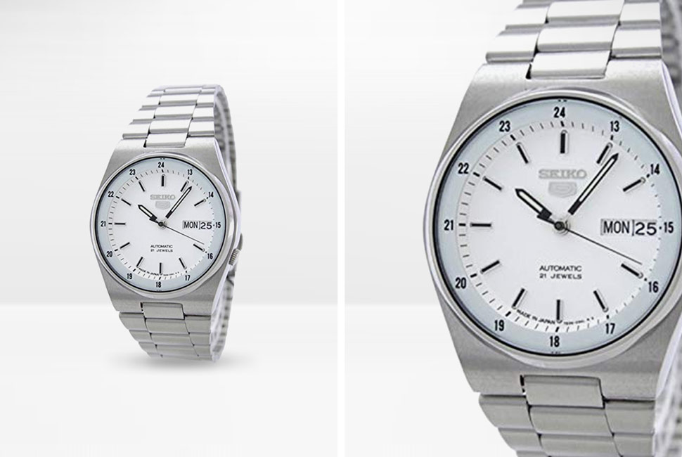 You’d be forgiven for thinking most Seiko 5’s were just field watches, as these are what you most often find for sale in the US, but this reference SNXM17J5 is one of the many, seemingly endless variants of the 5 that have been made over the years. It’s powered by the humble but reliable caliber 7S26, and can be had temptingly cheap. In addition to featuring an integrated design, the watch comes with a creamy white recessed dial and measures in at a compact 35mm in diameter and 11mm thick.