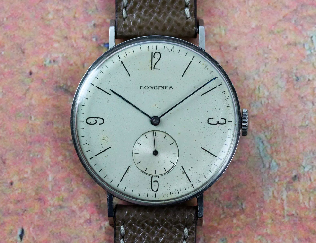 From the seller: This Longines is in good vintage condition. The case appears unpolished and untouched. The dial shows an even patina across the dial, normal wear-and-tear for these snapback, non-waterproof Longines from this era.