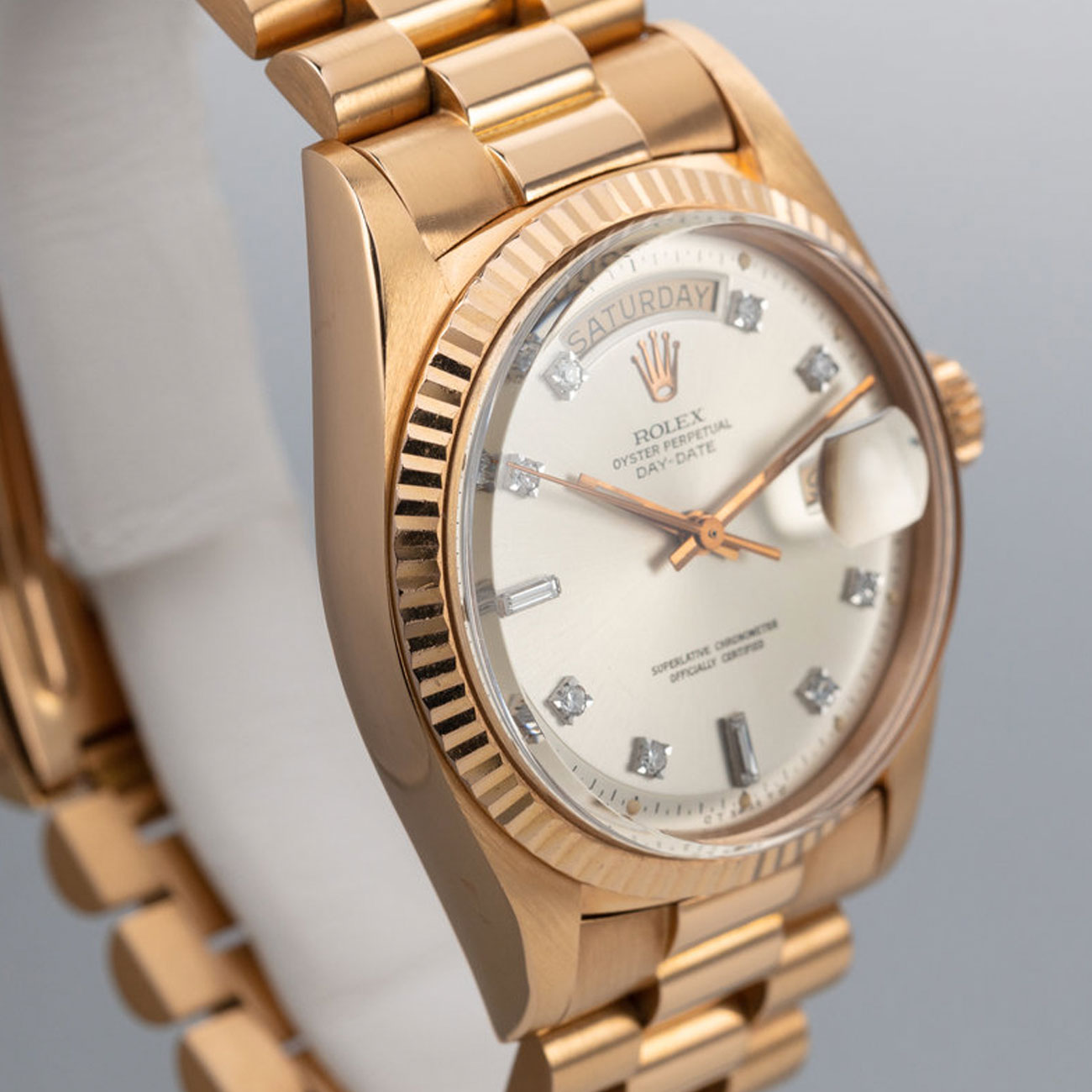 Rose gold Day-Dates are very hard to find, especially so in good condition. This lovely example has a very sharp case and immaculate dial. The matching rose gold President bracelet with 19 links is a huge added bonus.