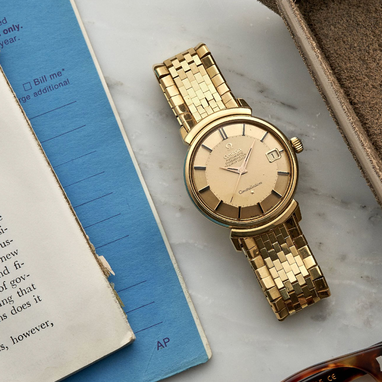 A Chronometer-certified Constellation is a wonderful watch in and of itself, but this particular example is made more special by including a brick-link bracelet in matchign 18K yellow gold.