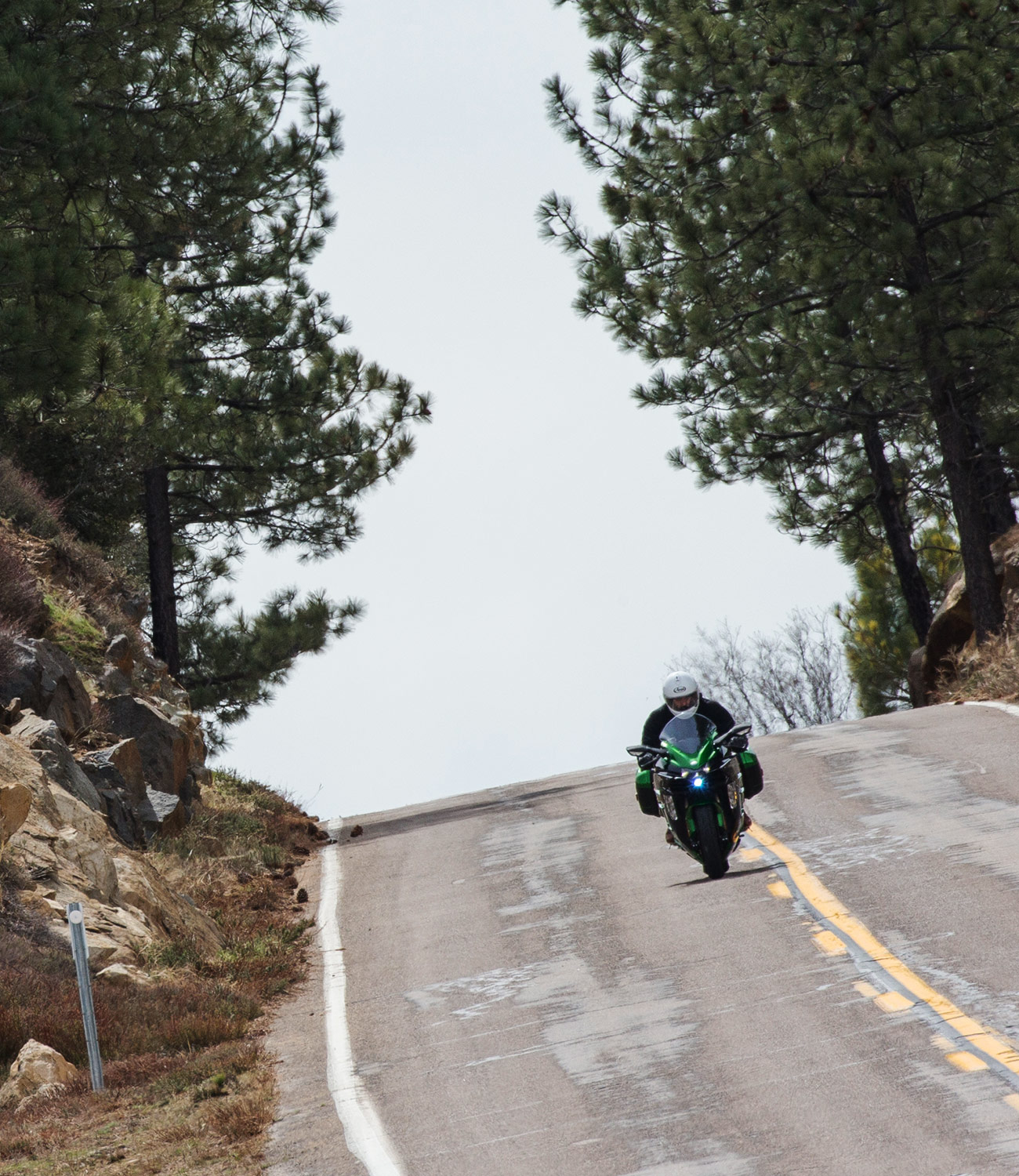 The manner in which the H2 SX transforms explosions into speed needs to be felt to be properly understood — the engine operates more like a warp drive than a traditional mill. Rolling onto the throttle turns the digital speedometer into a mess of pixels as the supercharger spools up more and more thrust. If you need to pass slower moving vehicles, there is plenty of torque down low to squirt by just about anything. The transmission has six gears, but you only ever need second and third to get from A to B with an intact license. To ensure riders are reigned in while learning the machine, Kawasaki equipped the SX with a full suite of rider aids — traction control, ABS, launch control, engine braking control and corner traction management — all of which operate seamlessly in concert with a Bosch Inertial Measurement Unit.