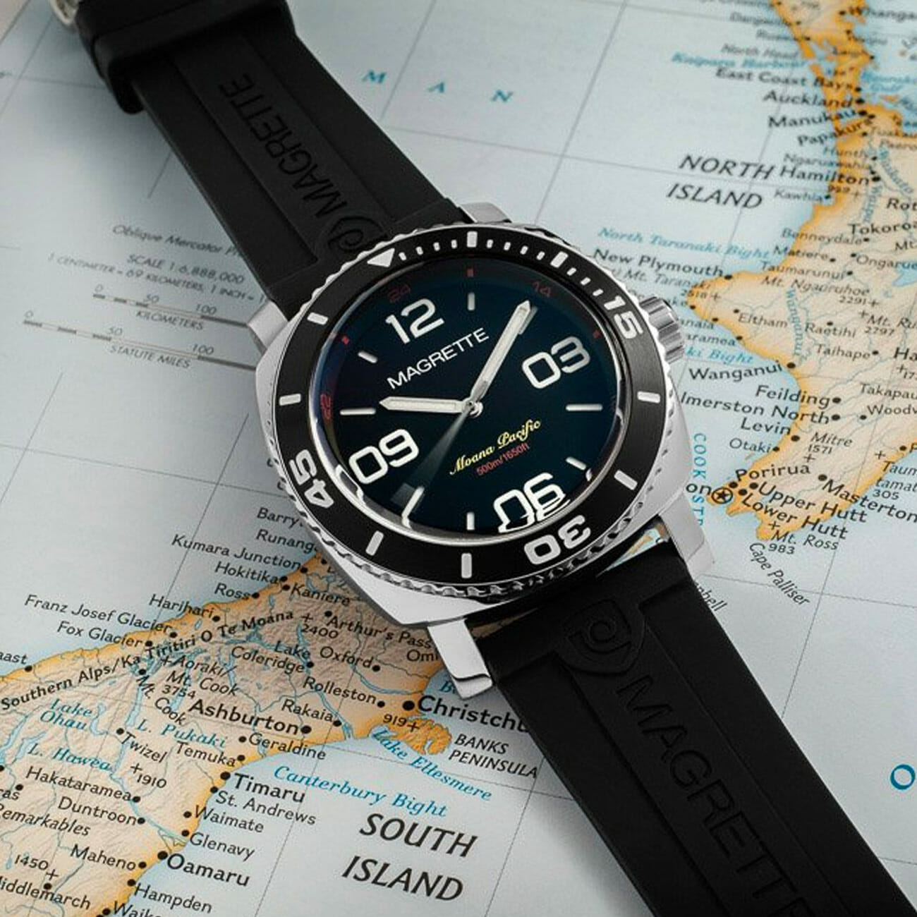 Founded in 2007 by Dion Wynyard McAsey, Magrette has spent more than a decade building watches aligned with sailing and diving. The large, cushion-shaped watches have a touch of Panerai about them. And, though the company has strong ties to McAsey’s New Zealand roots, its watches have global reach: the straps are made in Canada, the graphic design is based in Taiwan, the dials are from Germany, and the movements are from Japan and Switzerland.