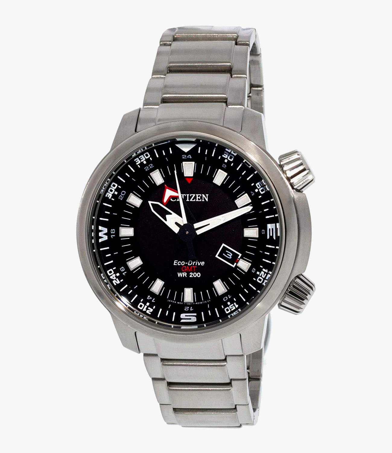 If you want to take your GMT watch into the water and not worry about it, but also don’t want to spend a ton o’ moolah, this Eco Drive from Citizen could be your best bet. It’s admittedly HUGE (49mm), but it’s got that cool dual-crown, Compressor-style case thing going on, and the battery should outlast you, given that it charges via sunlight.