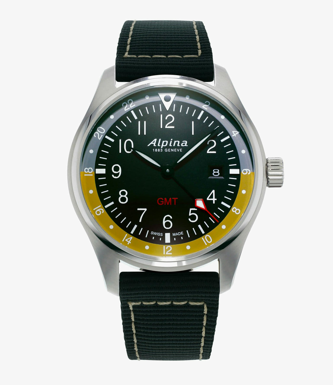 A step up in terms of fit and finish from the previous two entries, the Startimer Pilot Quartz GMT from Alpina is available in multiple dial and bezel colors and features a 42mm x 9.2mm steel case, scratch-resistant sapphire crystal and quartz movement with 25-month battery life. These sleek, pilot’s-inspired watches will look great on a variety of straps, and the black dial/black bezel variant especially can be dressed up or down.