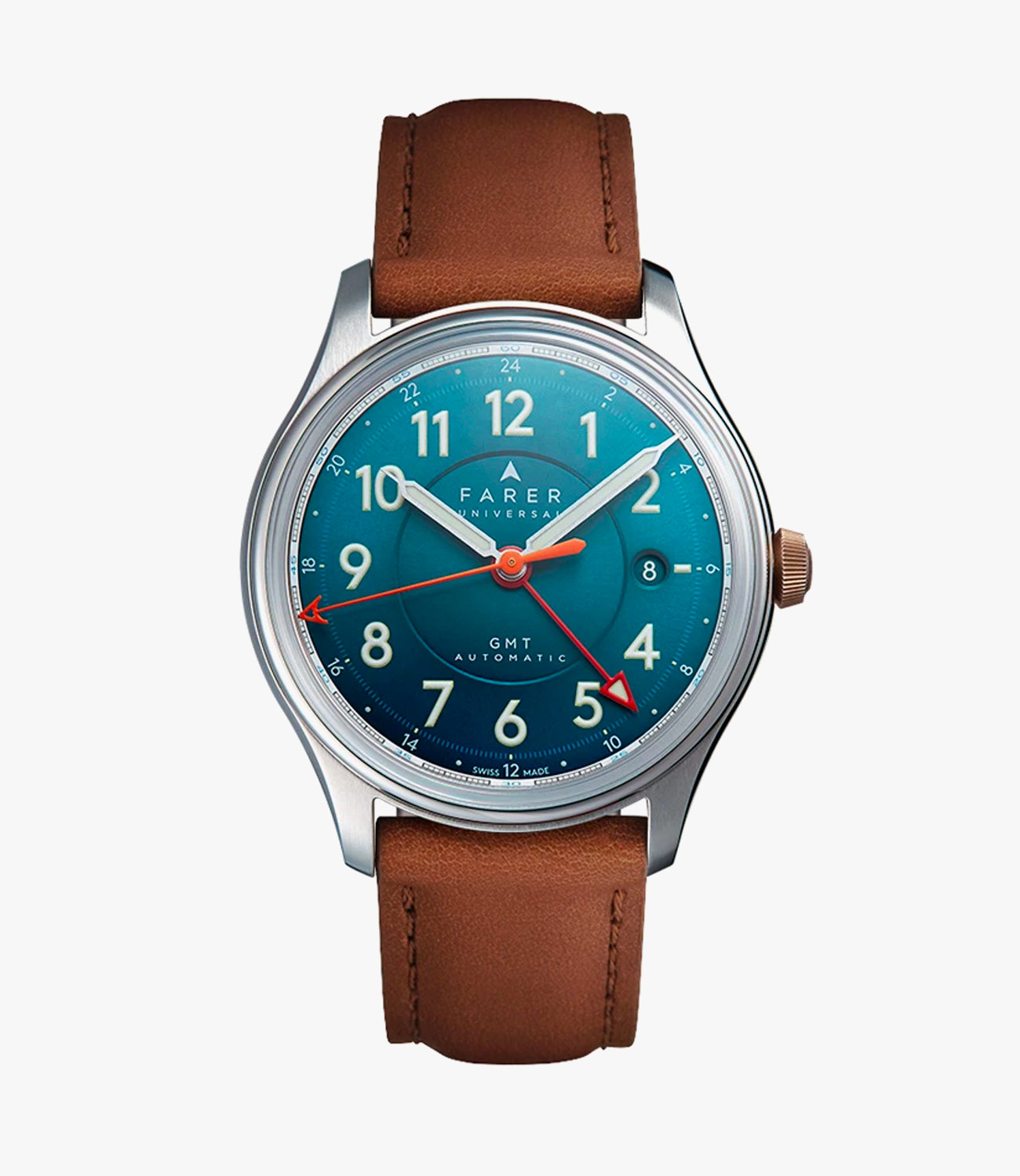 Believe it or not, you can get into a GMT watch for $149. Will this Timex Allied hold up like your GMT Master II? Eh — probably not. But it’s got a sleek, utilitarian black dial with dual-color bezel (black and blue), a 43mm case, a date window and 100m of water resistance. For the budget traveler, this may be the perfect option.