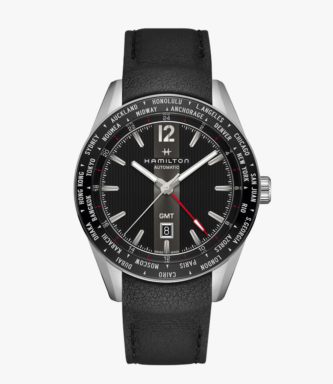 Admittedly a large watch at 46mm, the Broadway GMT is powered by the H-14 automatic movement and features a city ring around the ceramic bezel for keeping track of time in foreign locales. Also available on a matching steel bracelet for $1,545, the Broadway is a versatile take on the GMT/world timer.