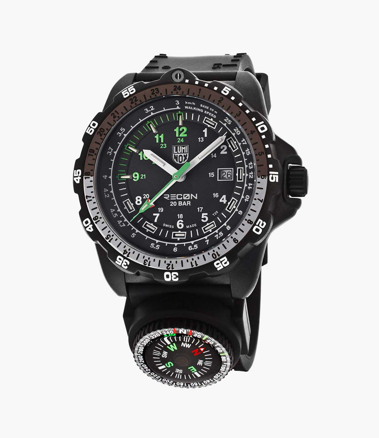 The Recon Nav PC is an analog-display watch that’s nearly as feature-rich as many of its digital counterparts. Featuring a GMT hand, rotating dive bezel, tachymeter scale, removable compass, tritium tube illumination, date window and a 46mm carbon reinforced polycarbonate case, this watch is perfectly suited for overland navigation.