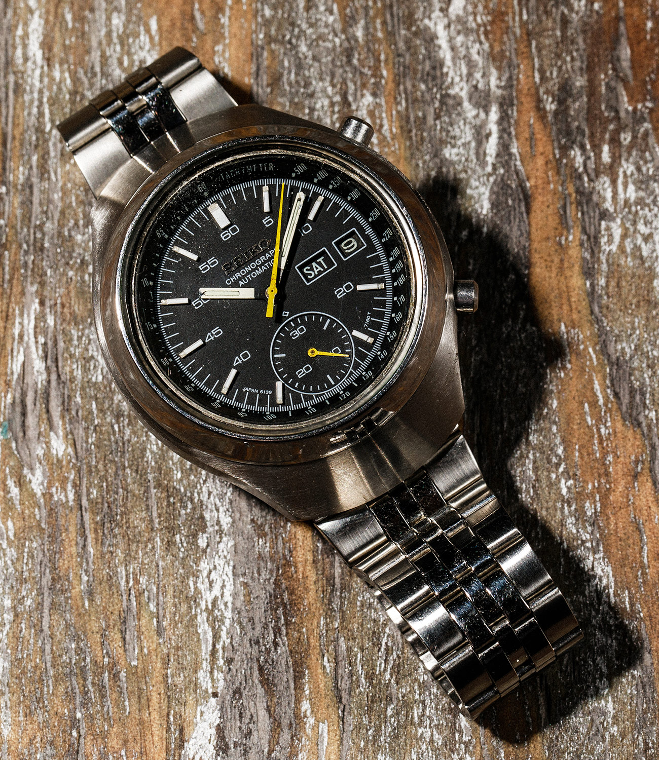 This is the Seiko that launched a love-hate relationship with watches. I bought it four years ago and paid $130 for it on eBay. This seemed like a lot at the time but, in retrospect, now feels like a bargain. When it arrived I forgave the fact that it was shipped in a SpongeBob Squarepants pencil case because I was so excited to have a vintage sports watch, not knowing this was one of the first automatic chronographs ever made.