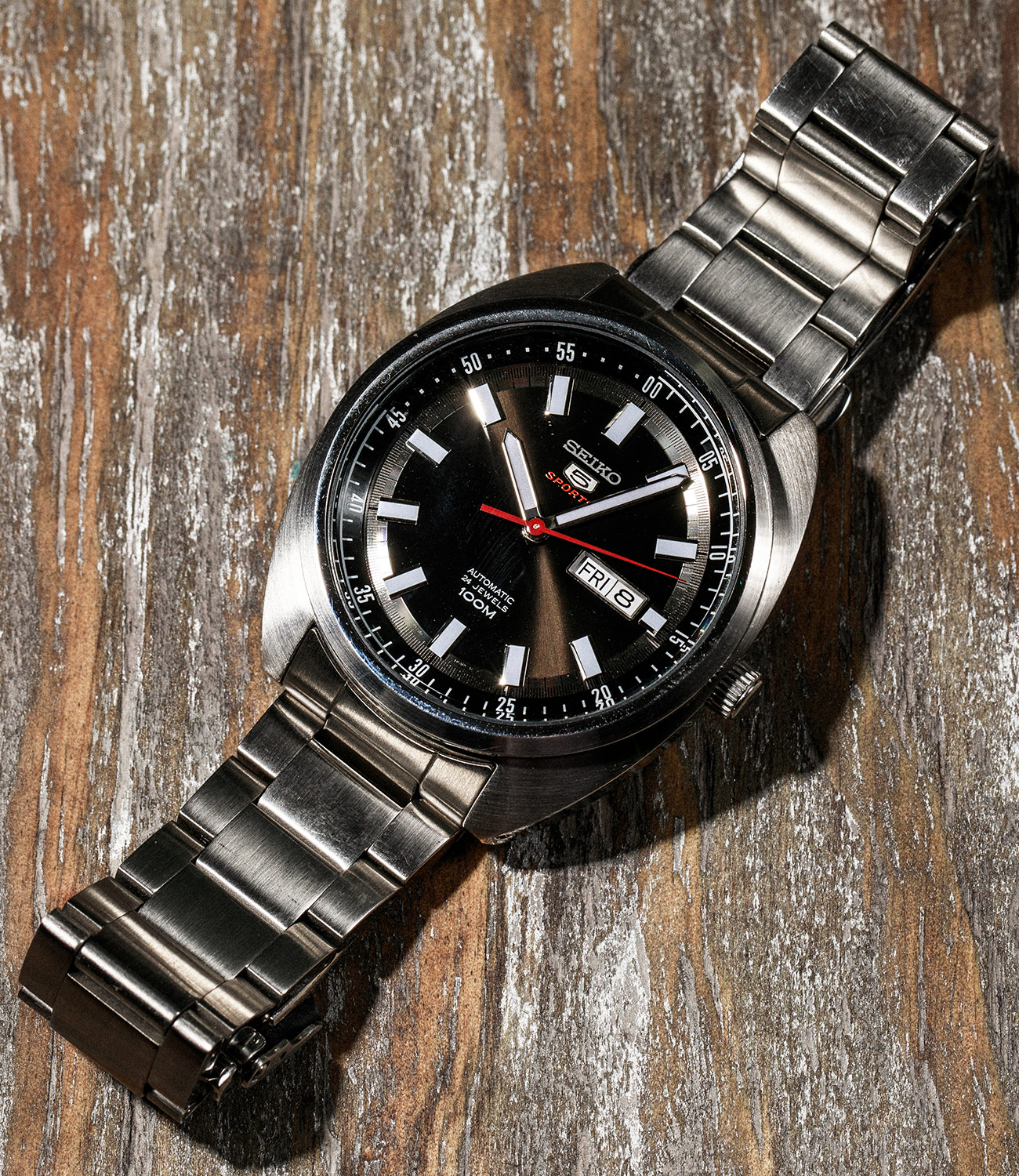 I’ve worn it to every US timezone as well as Switzerland, Ireland and Japan. The latter was on a trip to Seiko’s headquarters, where an executive caught a glimpse of it on my wrist; you could just see his eyes light up. It was the same kind of boyish enthusiasm I felt when I found out, by accident years after first acquiring it, the date was set by pushing in the crown, not pulling it out and twisting it. But recently the watch has stopped running unless it’s on its side. That’s the trouble with watches like these: the repair bills usually far exceed the cost to buy one. I’m not sure if I’ll fix it or not, but I know no matter what I’m never getting rid of it. — Andrew Connor, Staff Writer