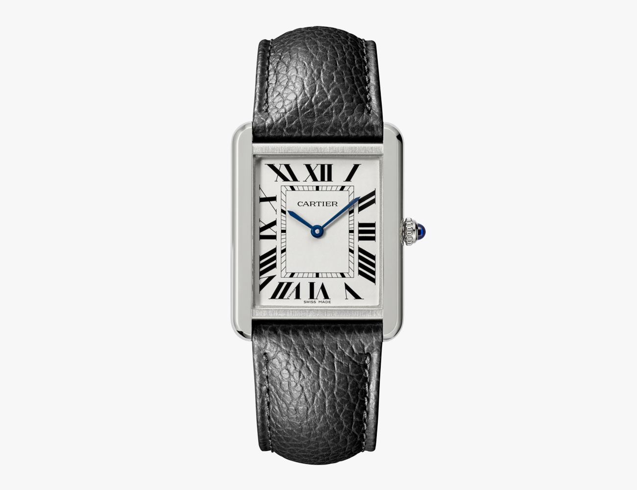 Though this larger version of the famed Cartier Tank features a quartz movement, all the rest of the hallmarks of the Tank are present: a rectangular case, an elegant white dial with Roman numerals, a thin handset, and a crown set with a synthetic cabochon-shaped spinel all scream classic Cartier.