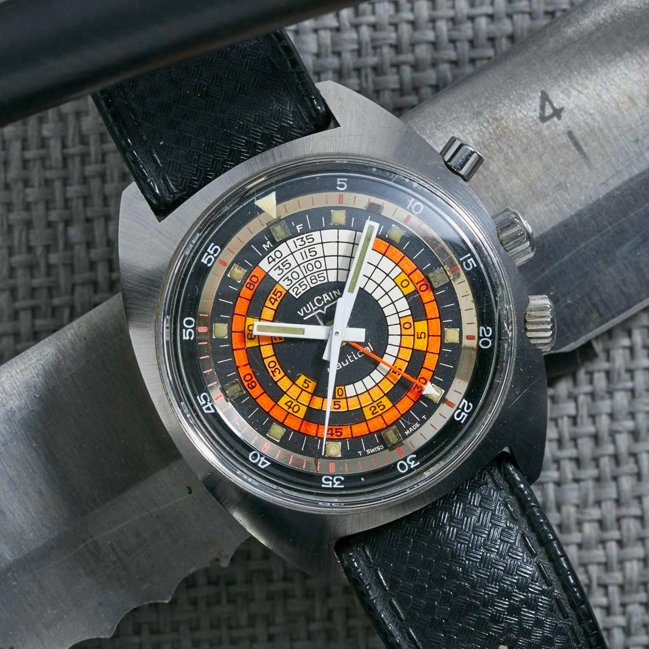 What we like: Along with the striking (and very 1970s) dial, what sets this wristwatch apart is the unique Vulcain Caliber 120 Alarm Movement at its heart. Developed in the late 1940s, it was the first alarm caliber to be put in a wristwatch. This still-functioning (and very loud) buzzing alarm adds a truly unique quality to an already handsome and stand-out wristwatch.