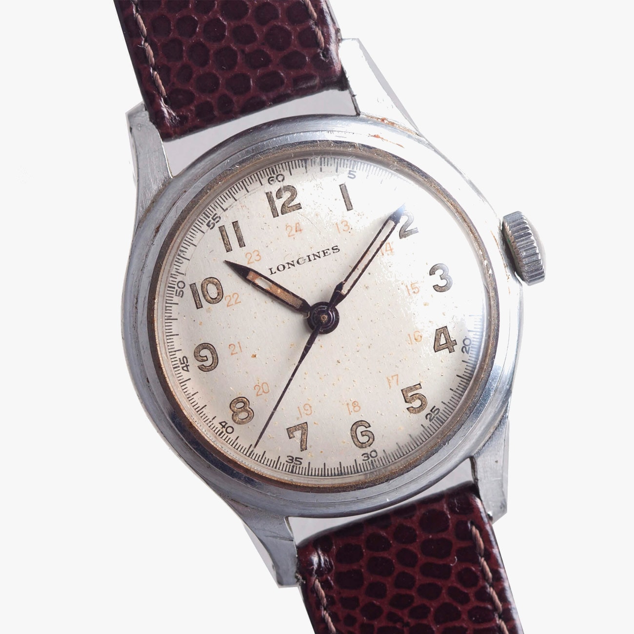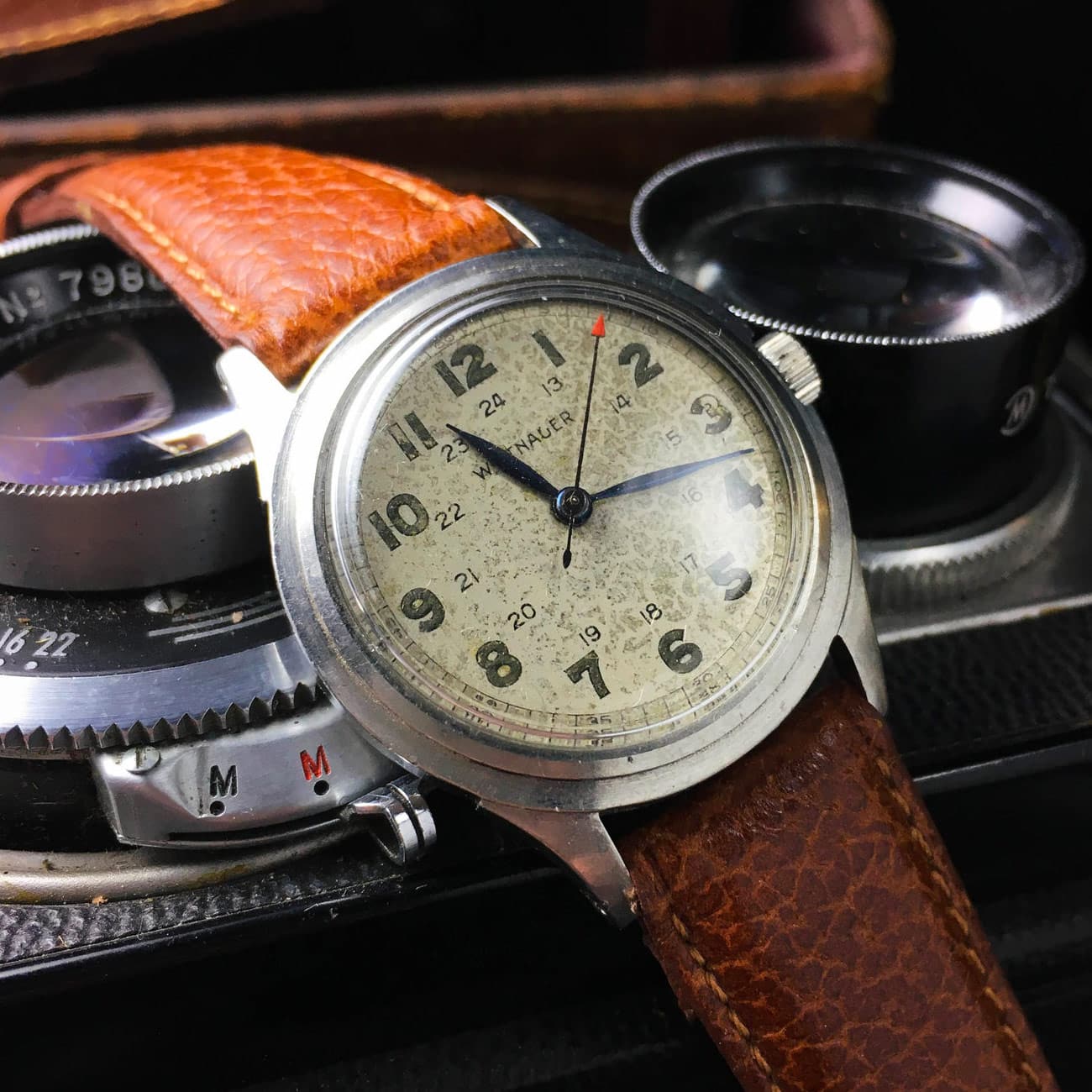 What we like: While not an issued watch, this small Wittnauer has many of the hallmarks of a 1940s or 50s mil-spec piece, including a screw-back case, 24-hour scale, radium-coated dial and outer minute track. Add to that some camouflage-looking patina, faded lume, step bezel and feuille hands, and you’ve got yourself a beautiful, military-inspired watch.