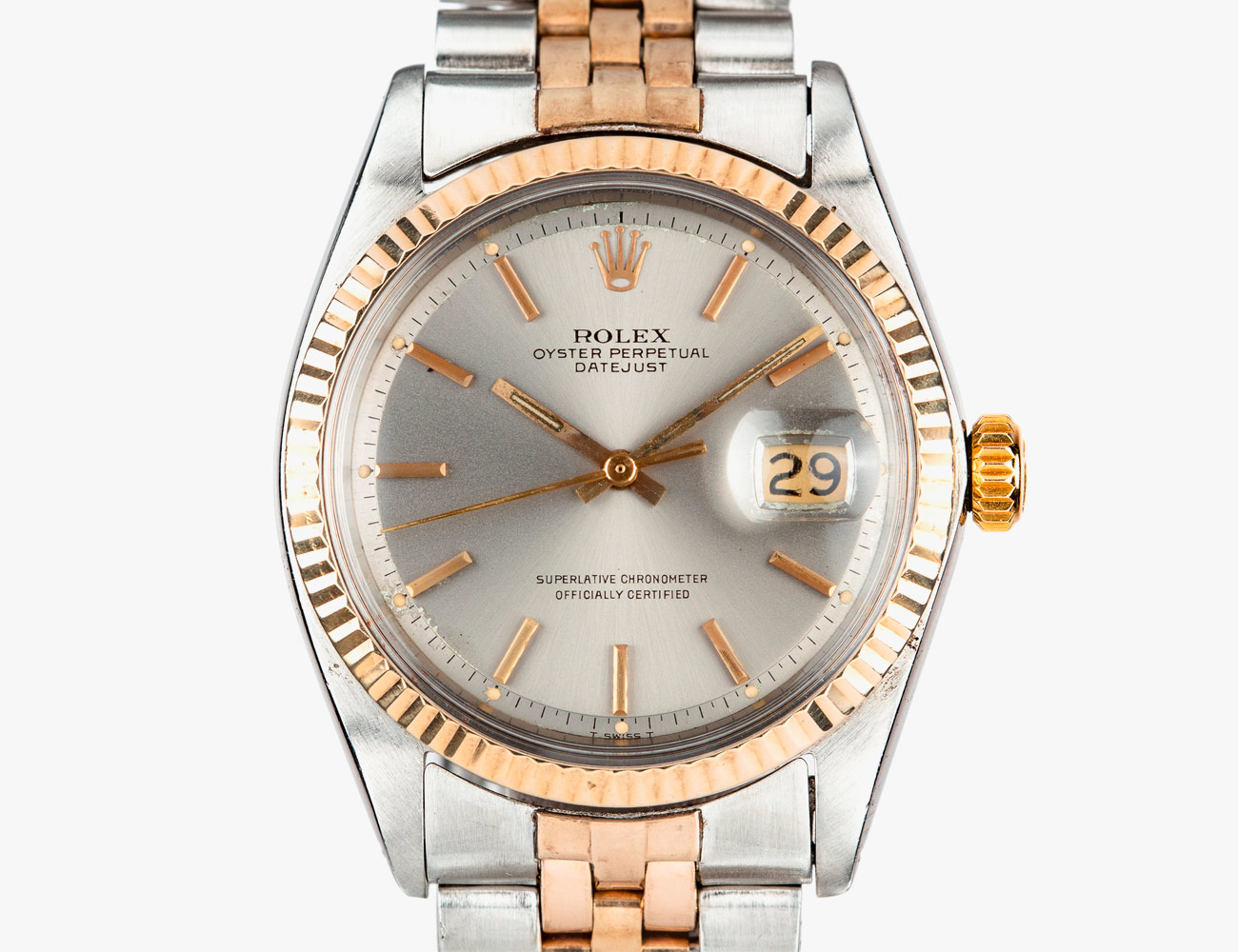 What we like: Two-tone watches are increasingly coming back in style, and few watches wear it better than the classic Date-Just. This example from the late ’60s wears gold on its bezel and braceelt, and it’s anchored well by a shimmering gray dial.