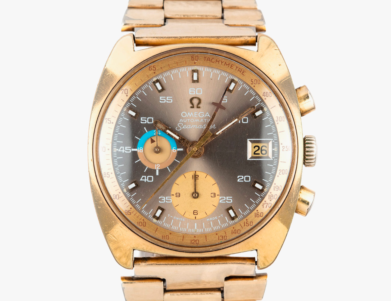 What we like: It’s not solid gld, but rather gold-plated, but that’s still okay. There’s a bold charm to this super-gold (-looking) Seamaster chronograph. What’s more, the watch’s metallic brown dial helps the watch cinch it’s fall-appropriate look. And while there’s some fading and chipping of the gold plating, it’s simply a nice additional patina that makes the watch unique.