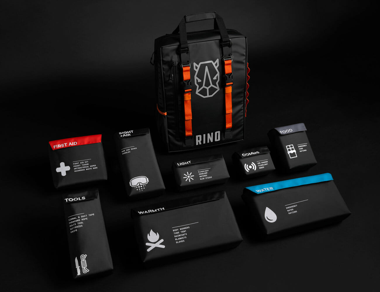 While naming conventions for these types of bags range from straightforward and standard like Ready America to abstract like The Seventy2, Reed tried to fall right in the middle of those two: an association naming convention. “I was looking at what people identify safety and preparedness with and trying to align that with something memorable,” Reed says. “To me, a rhino represented the rugged durability you would need in an emergency.” Combine that with a modular aesthetic, and a strong design utility, and you have the minimalist-looking bag. The ruggedness and natural robustness of the bag reminded Reed of rhinos since they have those qualities in spades.