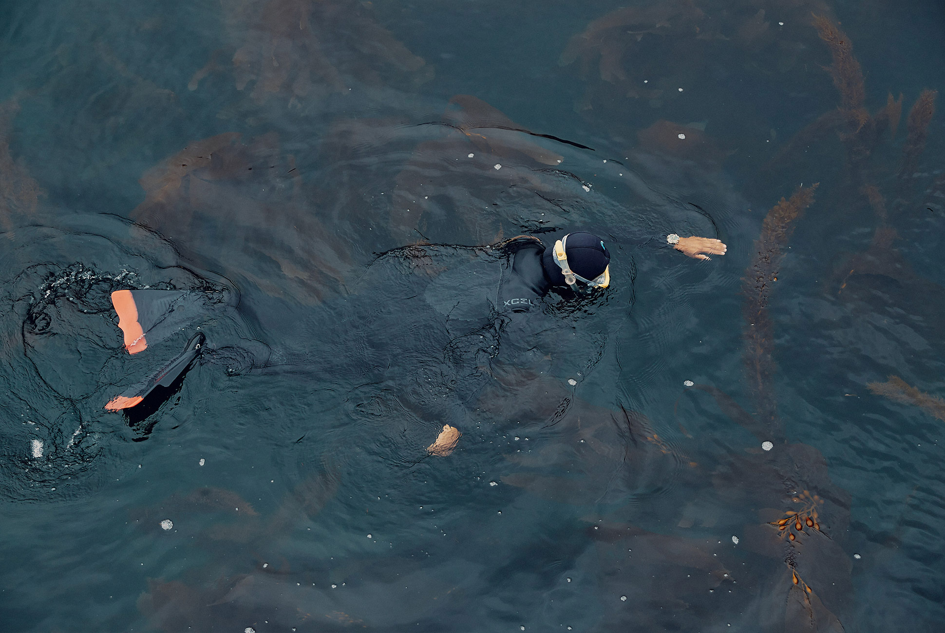 The jay is nowhere to be found so Chalott decides to look elsewhere for inspiration: the sea. He fell in love with snorkeling several years ago during a surf trip to Indonesia. The Channel Islands have some of the most vibrant diving in all of the US. Now, in May, the water has just edged to a chilly 59 degrees, so he squeezes into his 4.3mm Xcell Drylock wetsuit, then climbs into the water with one of the richest kelp forests on the island, as the seaweed dances with the swell below. Dark kelp bass, brilliant blue opaleye and bright-orange garibaldi—the state fish of California—dart among the kelp, a massive, flowing forest canopy viewed from above.