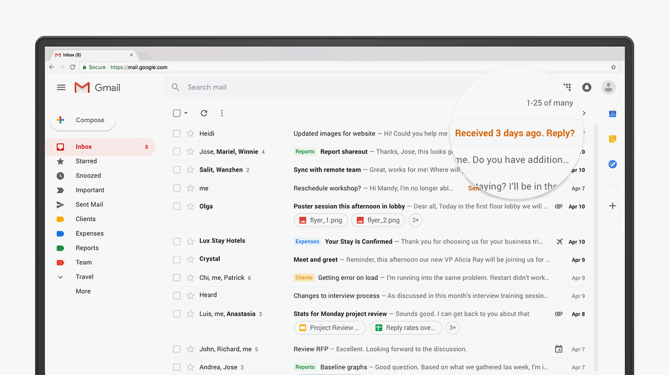 The updated Gmail definitely looks a little bit different from the Gmail you’re used to. There are a few things you’ll notice right away, like how attachments are visible right in the inbox so you don’t need to open every email or thread to see the document or image, and how your labels/folders take up more space on your screen.