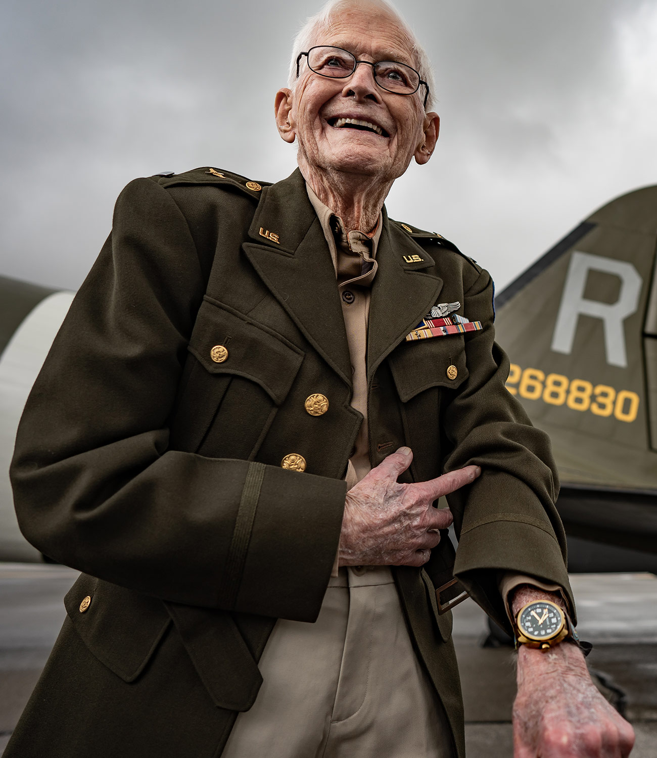 As he told us about these feats of daring, he repeatedly looked down at his eponymous TOCKR D-Day C-47 bronze watch, and he continually craned his neck to take in the C-47 parked outside, as if to confirm that all of this was actually happening. I will never forget his smile.