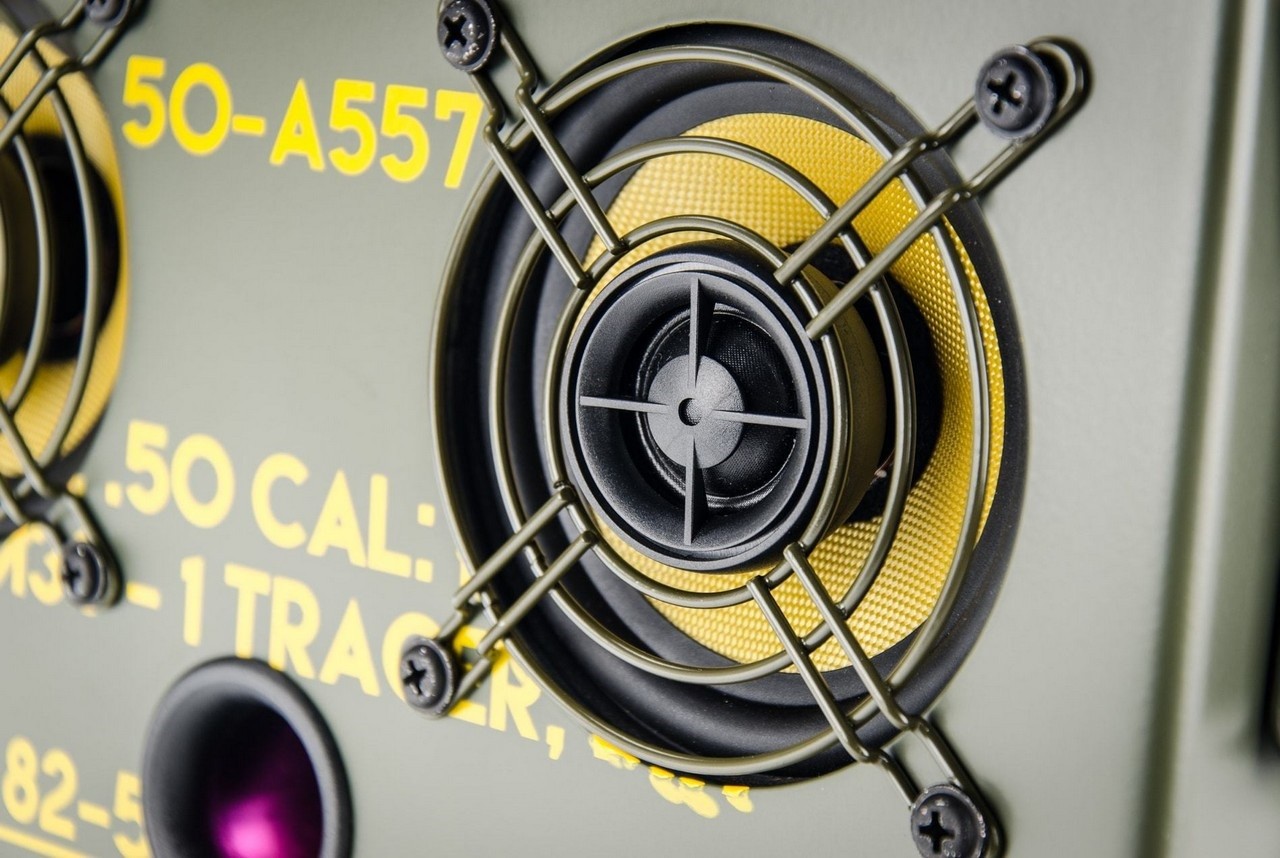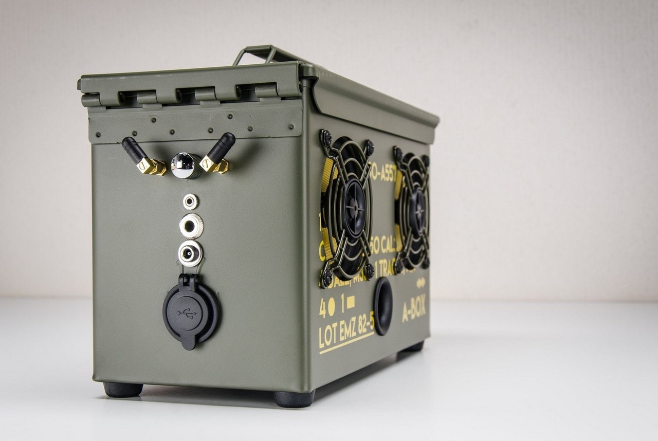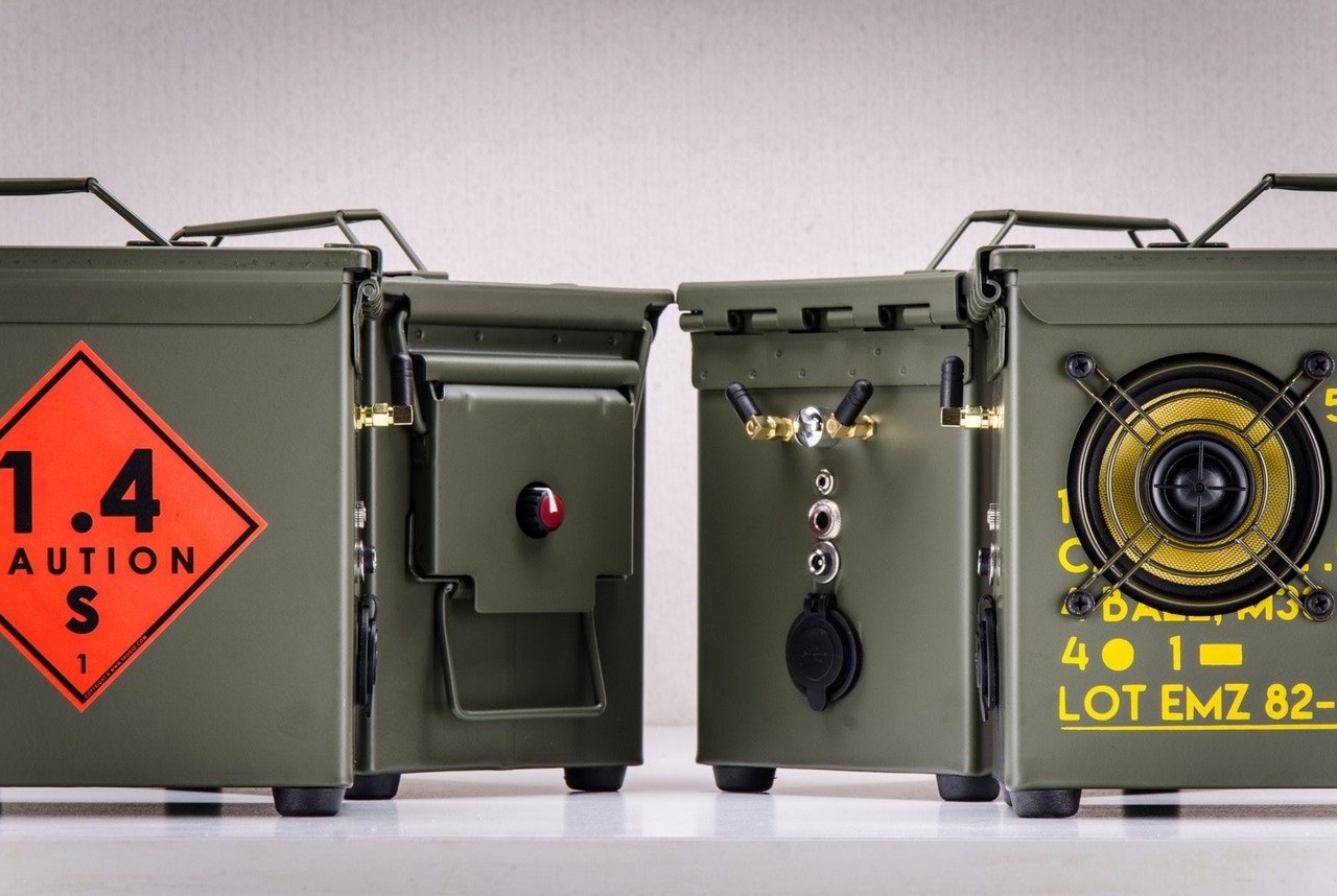 Fully handmade in Amsterdam, the compact speaker measures 11.8 x 6.1 x 7.7 inches and weighs between 12.9-14.3 pounds, depending on the battery you choose. The ammo can is reinforced and insulated to make it sound as great as a wooden rig, while a 200-watt RMS audiophile amplifier driving custom filtered, Kevlar-coned coaxial speakers with soft-dome tweeters, is capable of processing High-Res audio.