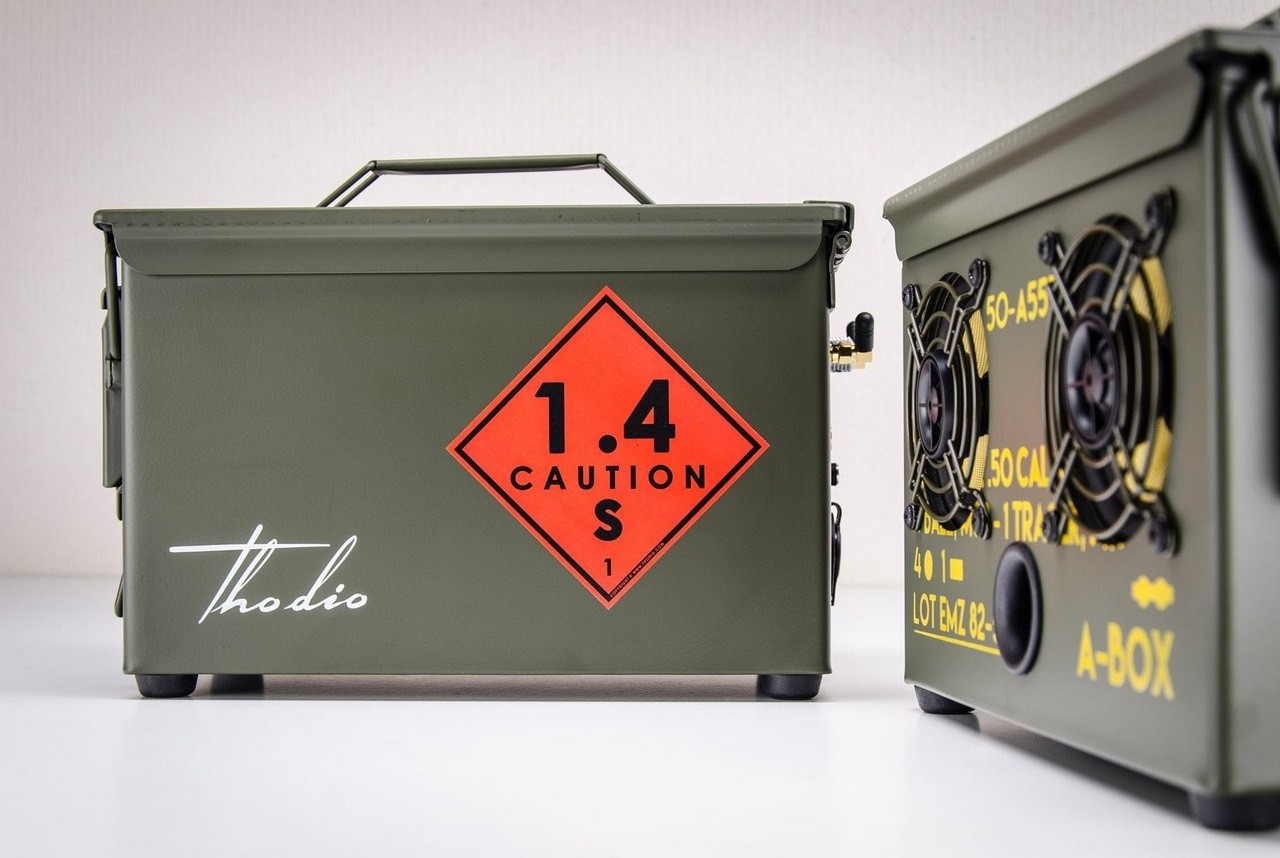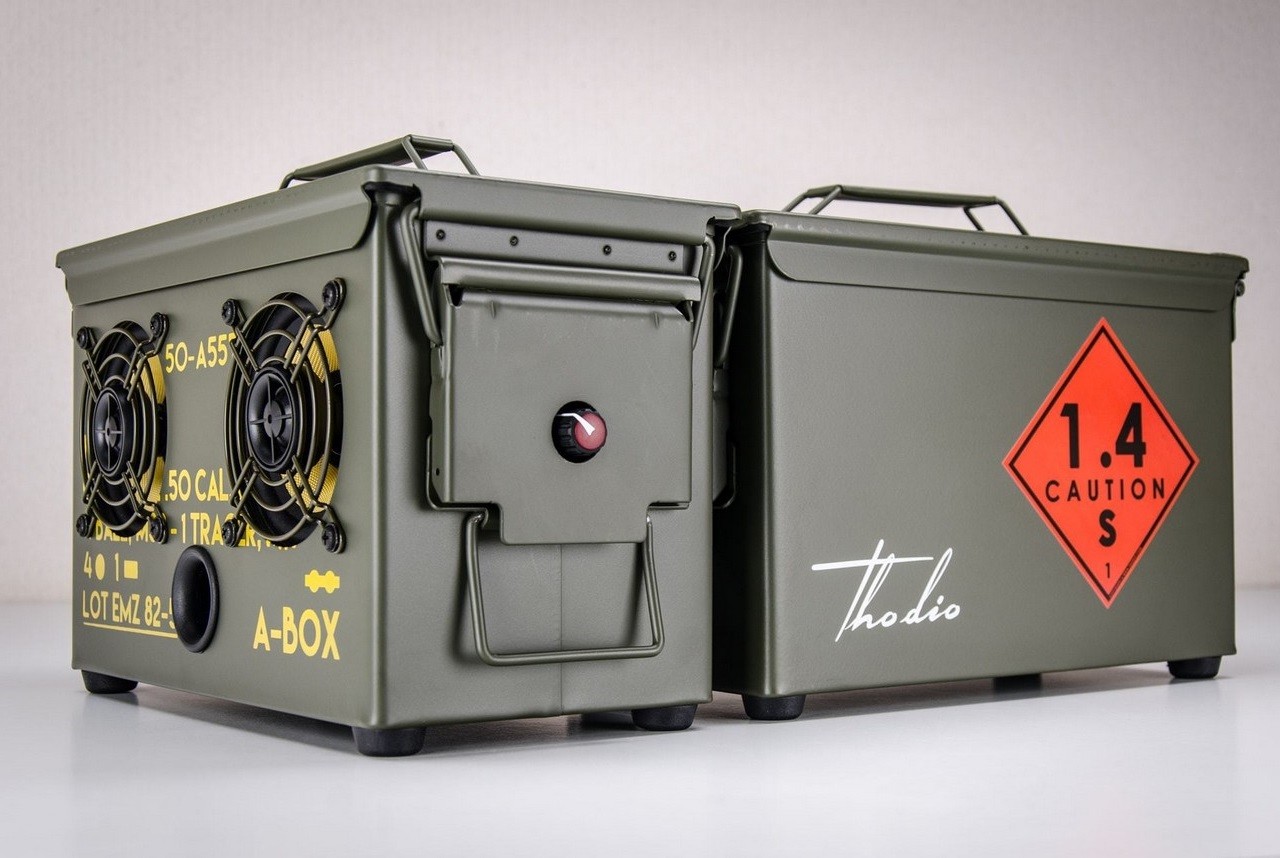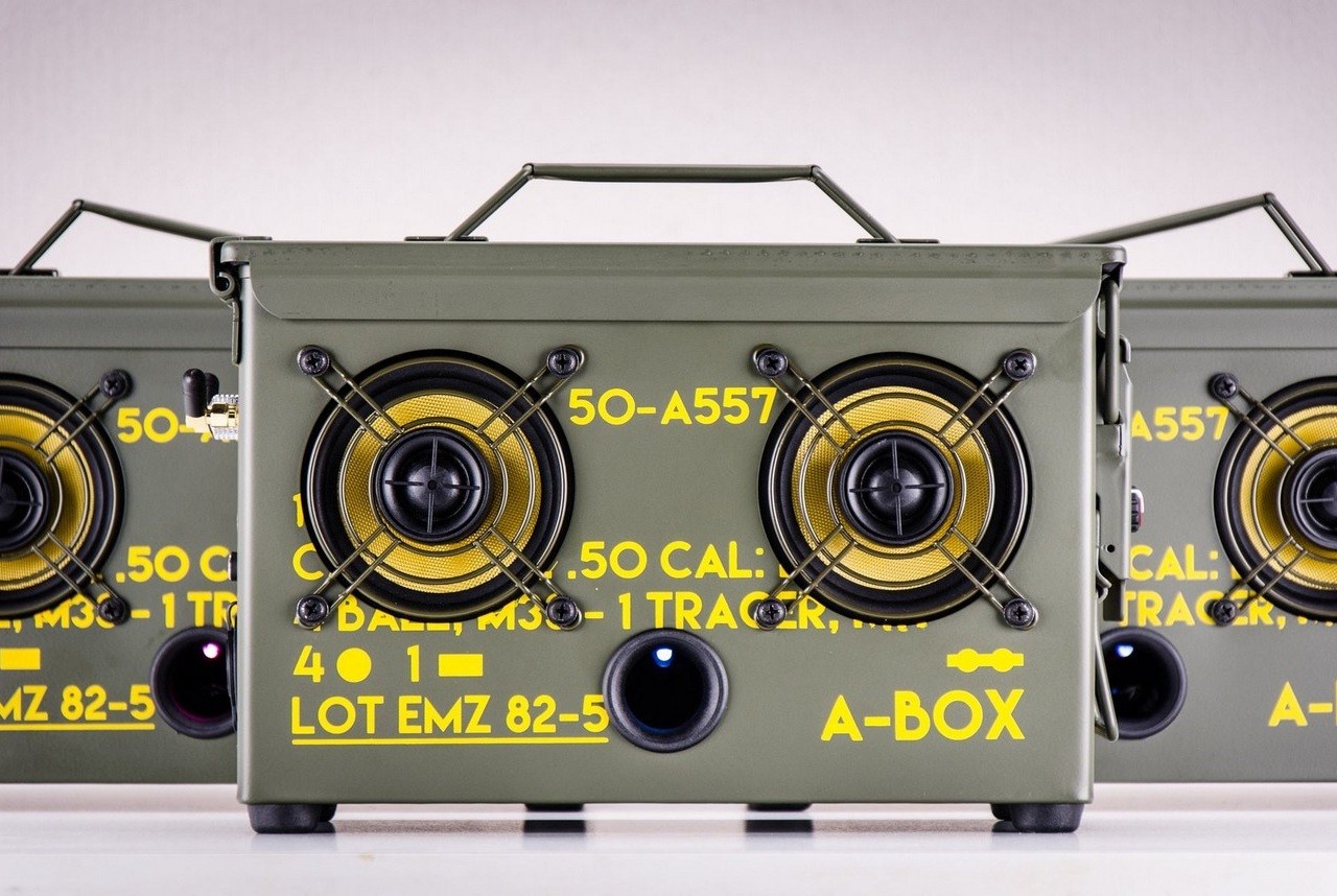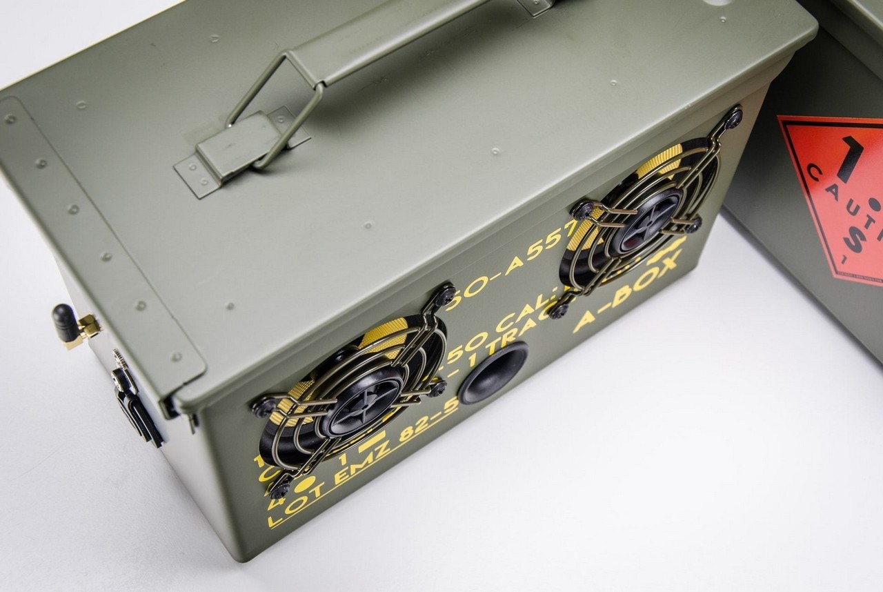 Developed and perfected over the last 8 years, the Thodio .50 Cal Ammo Can Boombox is a wireless speaker built into an original 50’s design .50 CAL ammo can. Also known as the A-BOX, the portable unit can handle serious abuse while offering an impressively loud and clear sound.