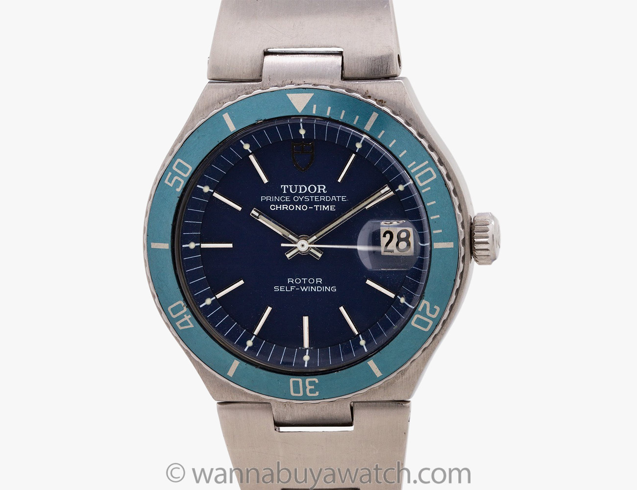 From the seller: Unusual and cool modern design tonneau shaped Oyster case with screw-down Rolex crown, screw-down Rolex case back, faded blue elapsed-time bezel, and integral large curved-link, Tudor-signed bracelet with deployant clasp. Includes acrylic crystal and original navy blue dial with applied silver indexes and silver baton luminous hands.