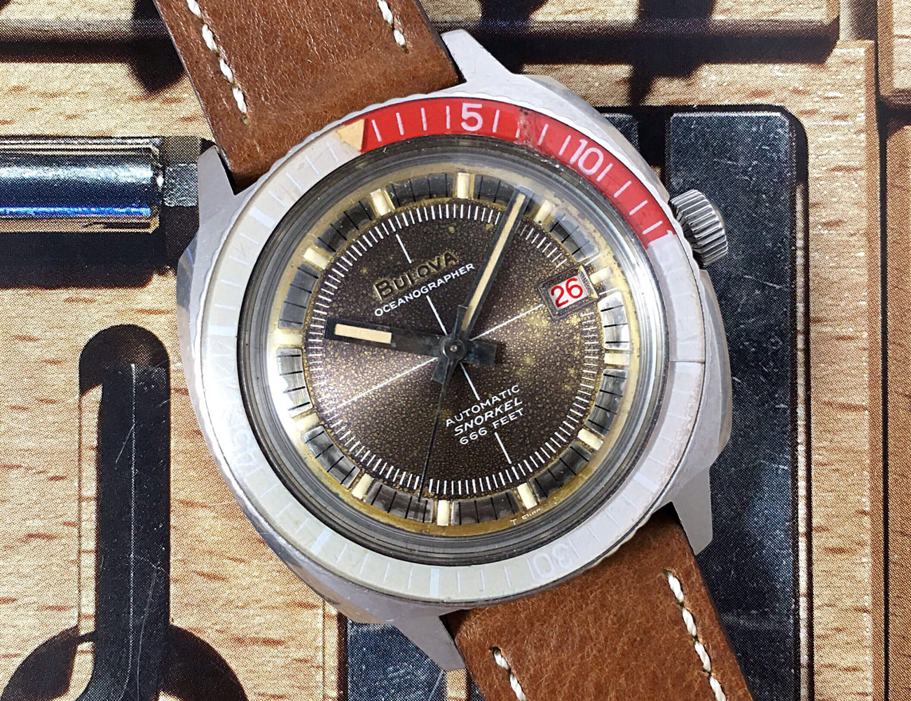 What we like: Bulova’s beloved “Devil Diver” came in many forms, and this example from the ’60s has a lot to offer for the money. It has a cushion-shaped case, an automatic movement that looks exceptionally clean and a dial that’s taken on an incredible brown patina over the years.