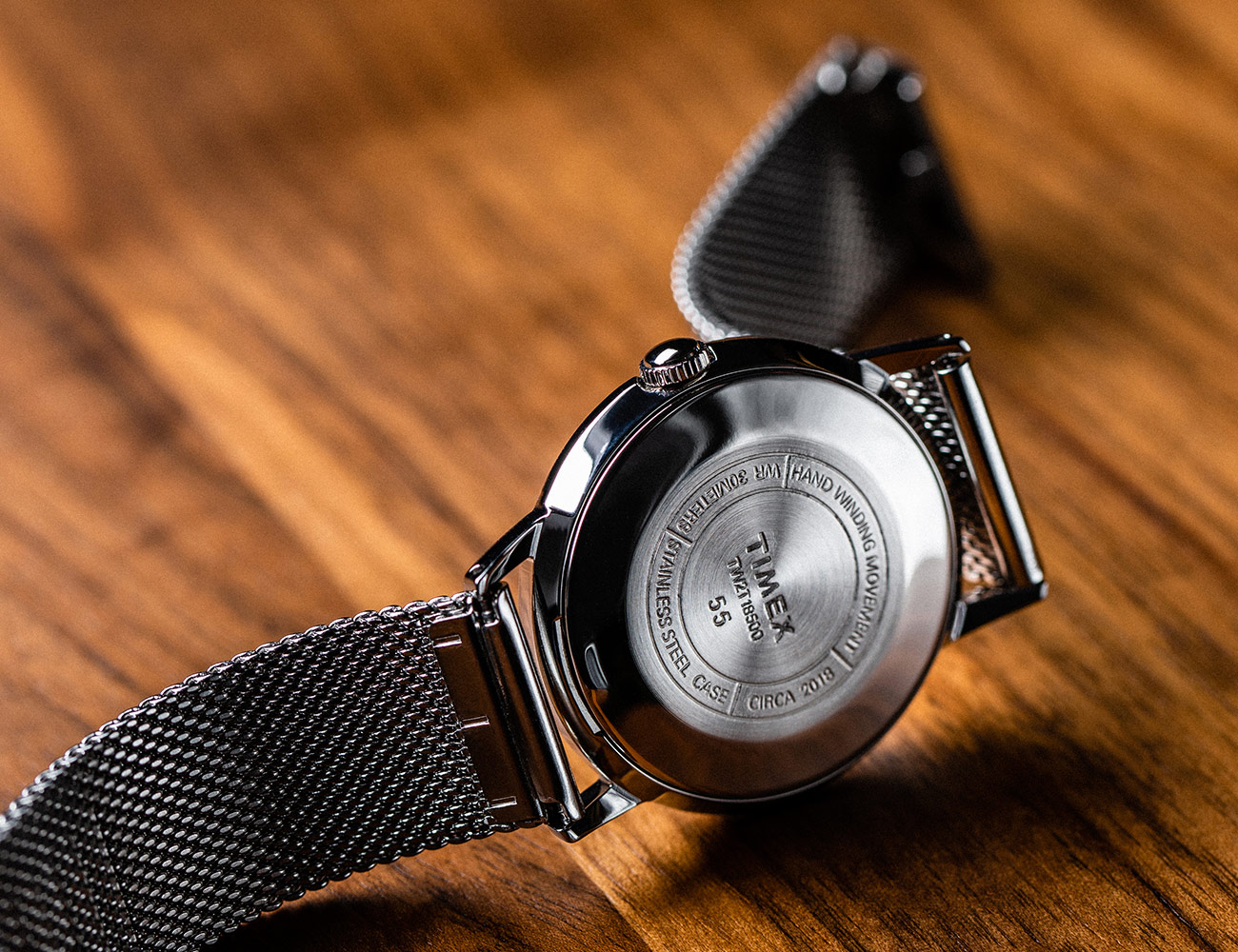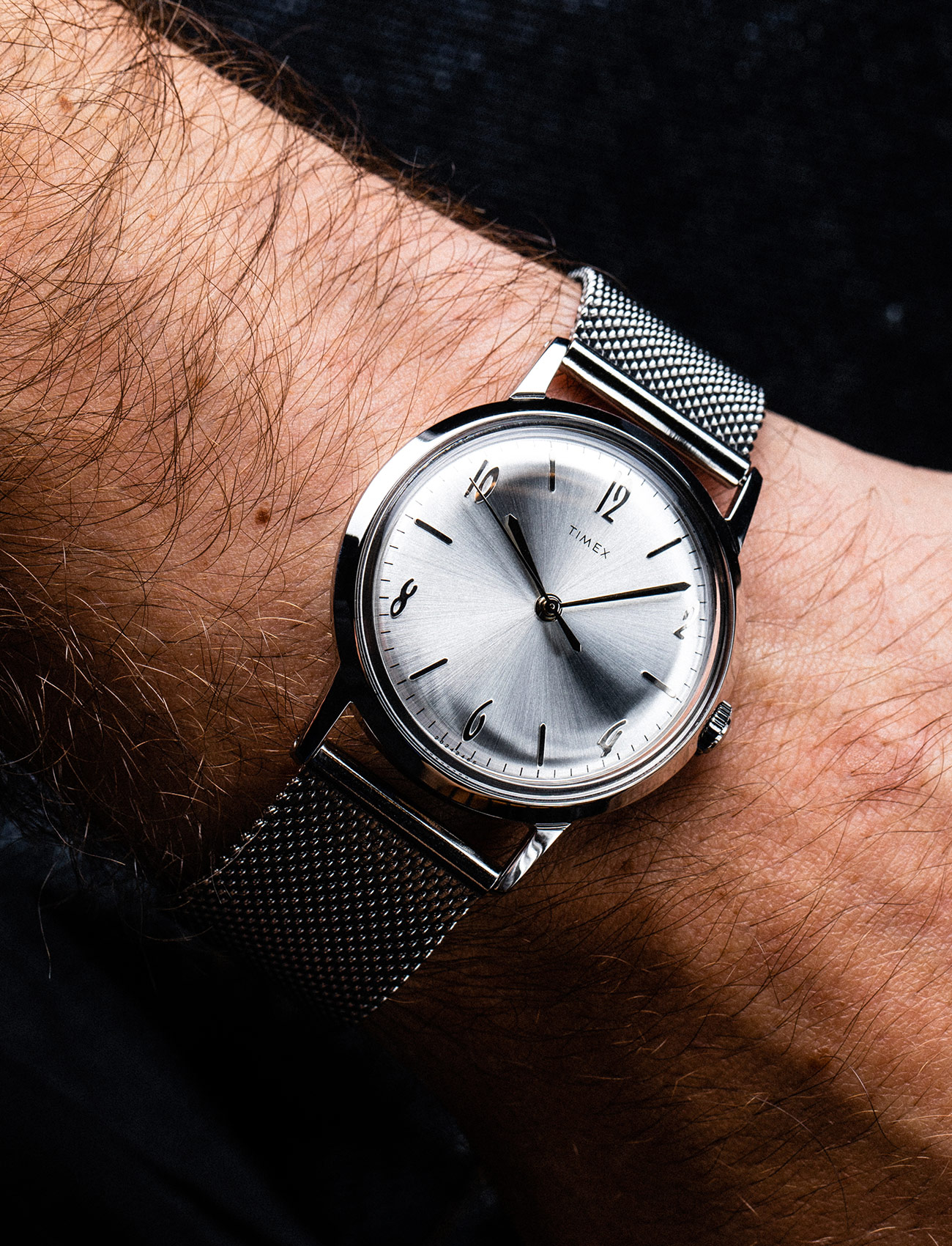 The Timex Marlin represents the confluence of several trends in the watch industry: a younger generation adopting mechanical timepieces, watch companies finally embracing the idea of crafting smaller-cased watches and the industry continuing the trend of producing vintage-inspired wares. First came the Marlin on a black leather strap, which worked beautifully as an inexpensive dress watch; then came the same watch but with a black dial produced in collaboration with Todd Snyder, which was even better suited to a formal setting. Now, Timex’s next collaboration with the venerable menswear brand has yielded a Marlin on a steel mesh bracelet — a decidedly more “everyday” take on the now-classic vintage reissue.