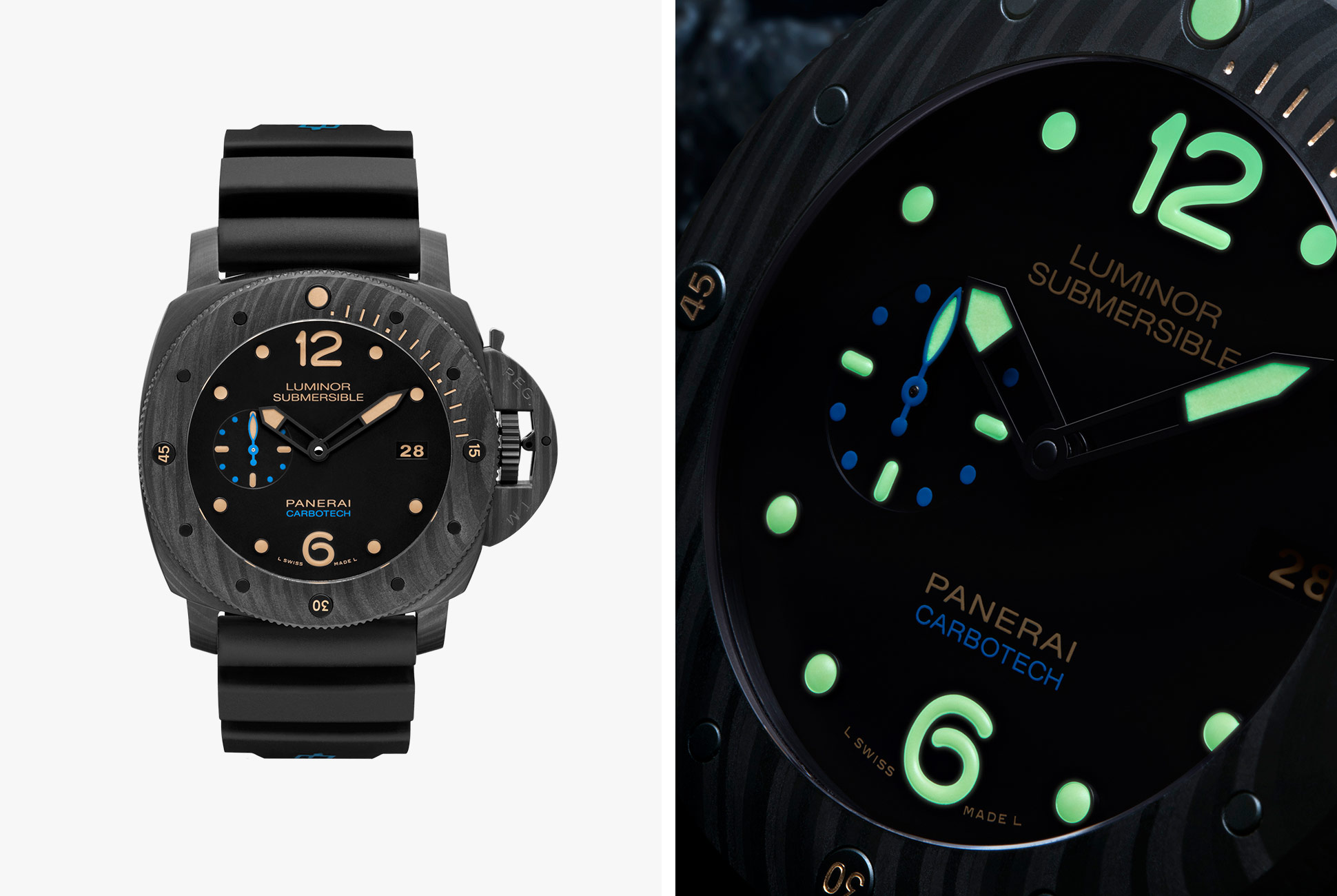 Like the rest of the Submersible lineup, the Luminor Submersible 1950 Carbotech 3 Days is an update on the original Luminor design, featuring a legible dial, a rotating diver’s bezel and a case with a 300-meter depth rating. That case, though, is made from a material Panerai dubs Carbotech. It’s a composite material made from thin sheets of carbon fiber that are compressed at a controlled temperature under high pressure and never before used in the world of watchmaking. The result is a durable material with a unique matte black finish that’s lighter than ceramic or titanium and strong enough to protect an in-house automatic movement with a whopping three-day power reserve.