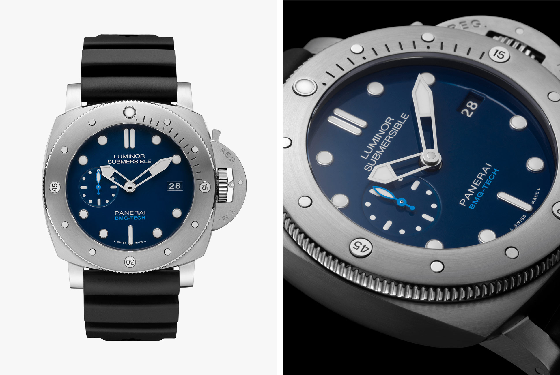 Not all revolutionary innovations are discernable by the human eye — when looking at the 47mm Officine Panerai Luminor 1950 Submersible BMG-TECH™ you might not take notice, but this is the first mechanical watch whose case is made of the material.