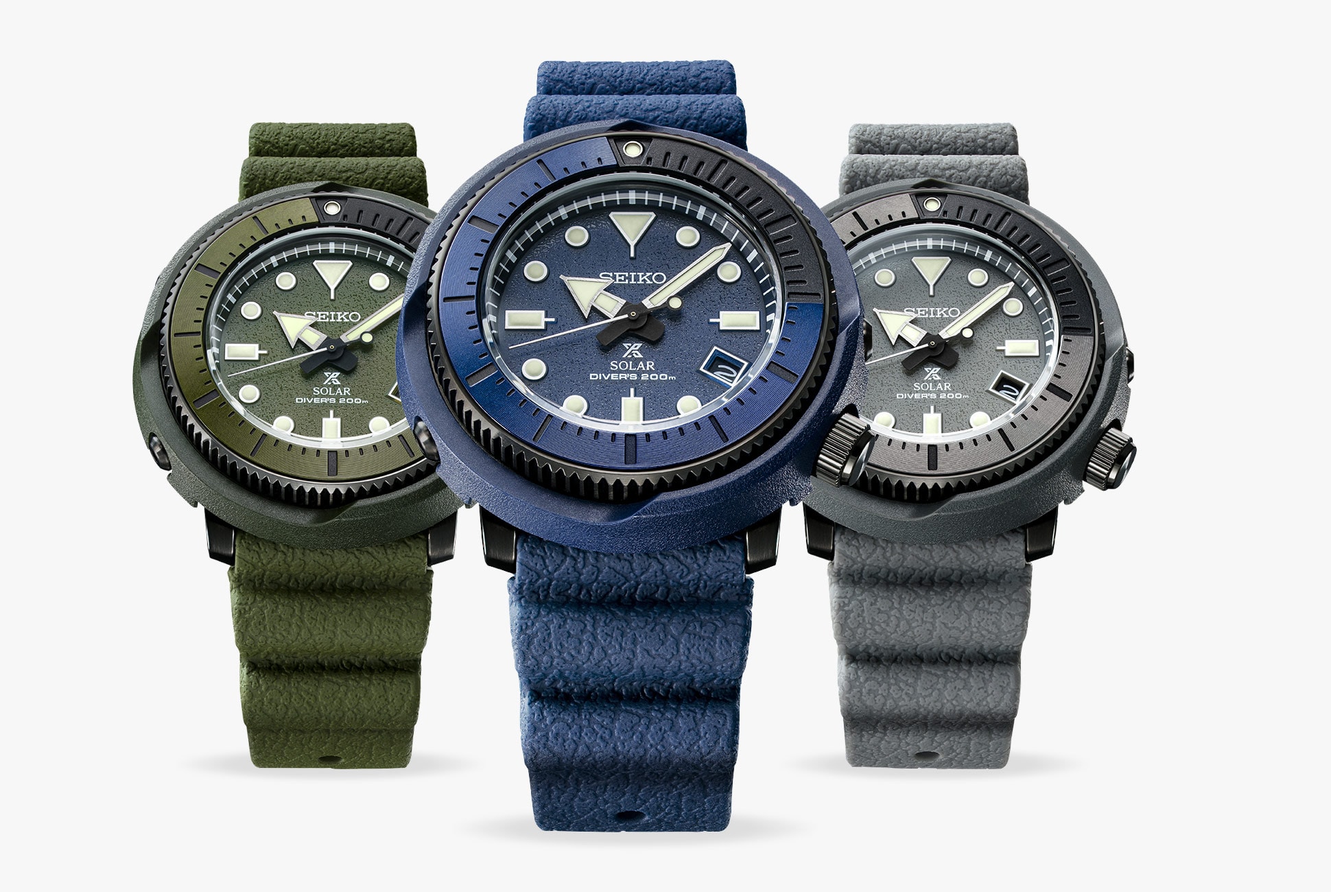 The monochrome blue, green, and gray color options stand out on the wrist while featuring the details of the Prospex line: matching silicone straps, solar-powered movements, bright luminescent on the dials, unidirectional rotating bezels, and 47mm lightweight cases that are water-resistant down to 200m. Utilizing the signature “Tuna Can” case style, the three Prospex Street Series timepieces take the fabled dive watch design to new places with a comfortable and eye-catching wear.