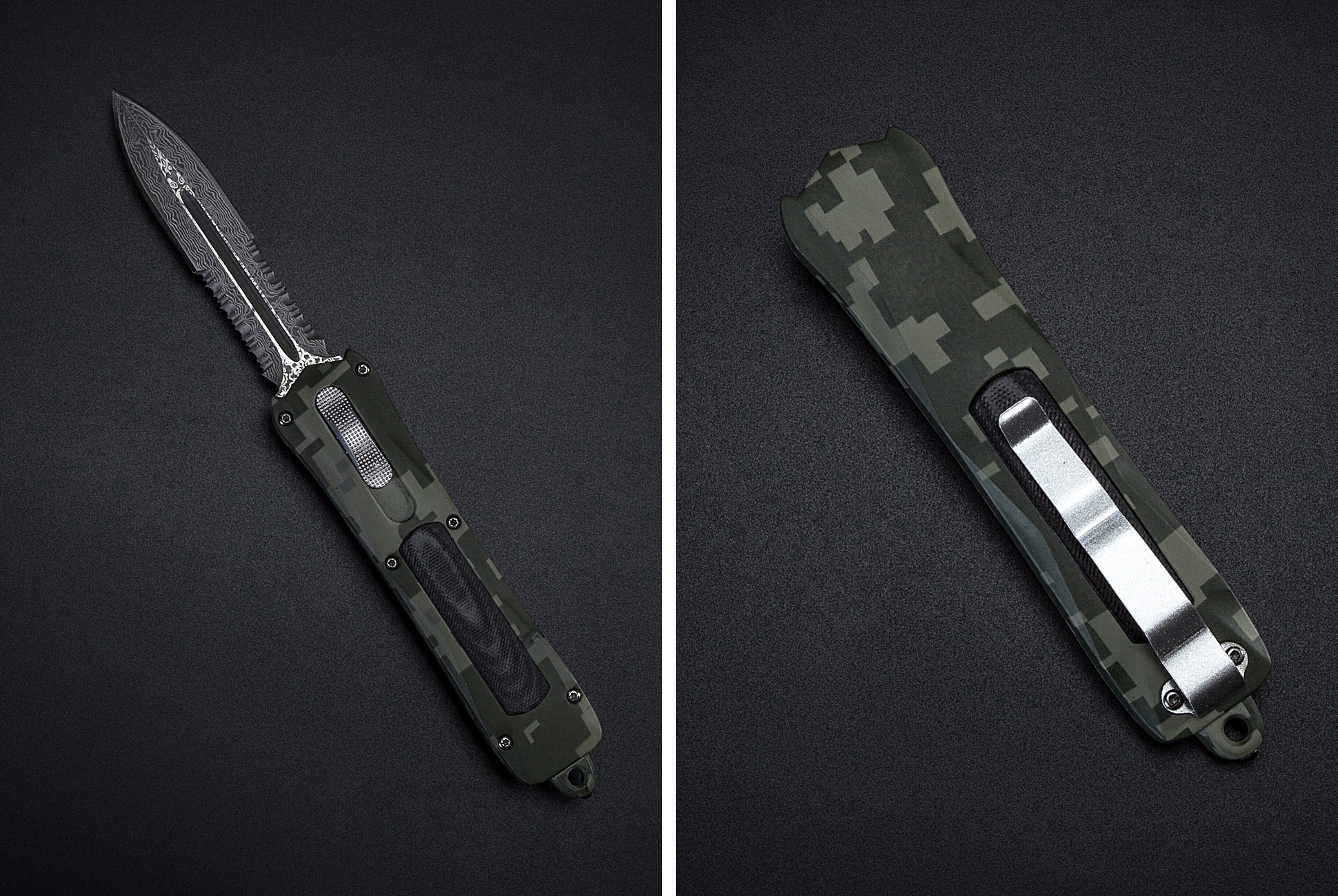 The Mirage is a functional switchblade with a 3.5-inch Damascus steel pattern blade that’s deployed, rapidly, with the sliding of a two-way switch. The double-edged blade is both plain and serrated, so it’s handy for all types of cutting tasks. The handle is a zinc-aluminum alloy that’s skinned in a subtle digital camo print and also features a pocket clip for practical accessibility. For additional functionality, Tekto Gear added a window breaker to the butt of the Mirage.